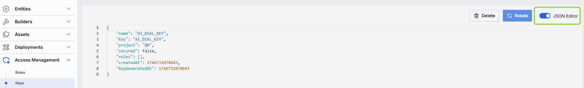 - JSON Editor (Toggle): Switch between the form-based UI and raw JSON view of the key’s configuration. Use JSON mode for copy-paste or advanced edits.