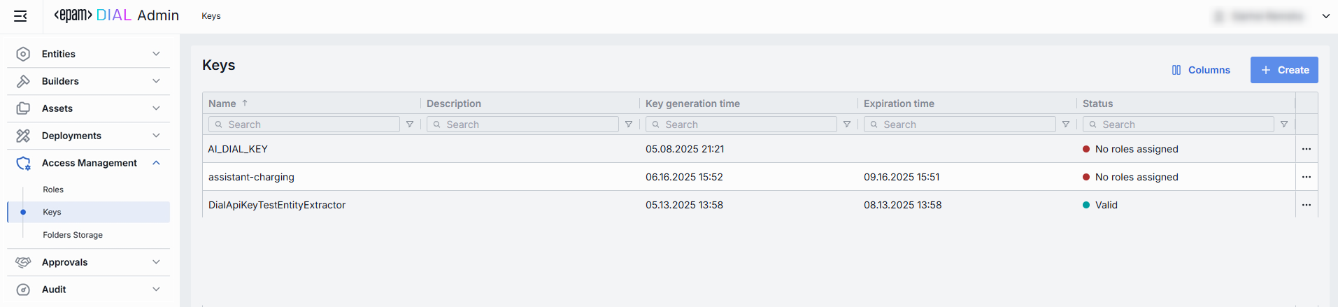 The Keys page provides a centralized view and management interface for all API keys in DIAL.