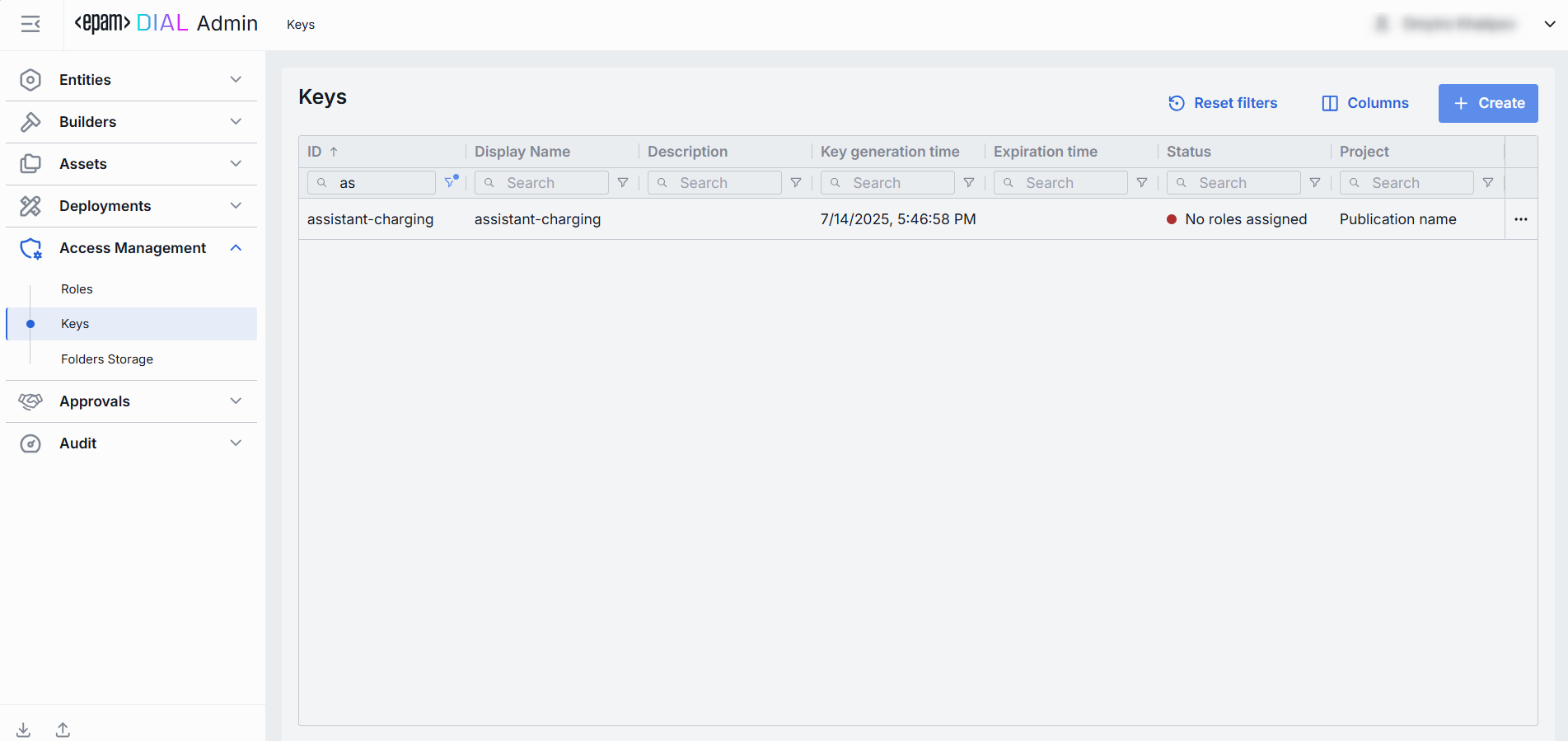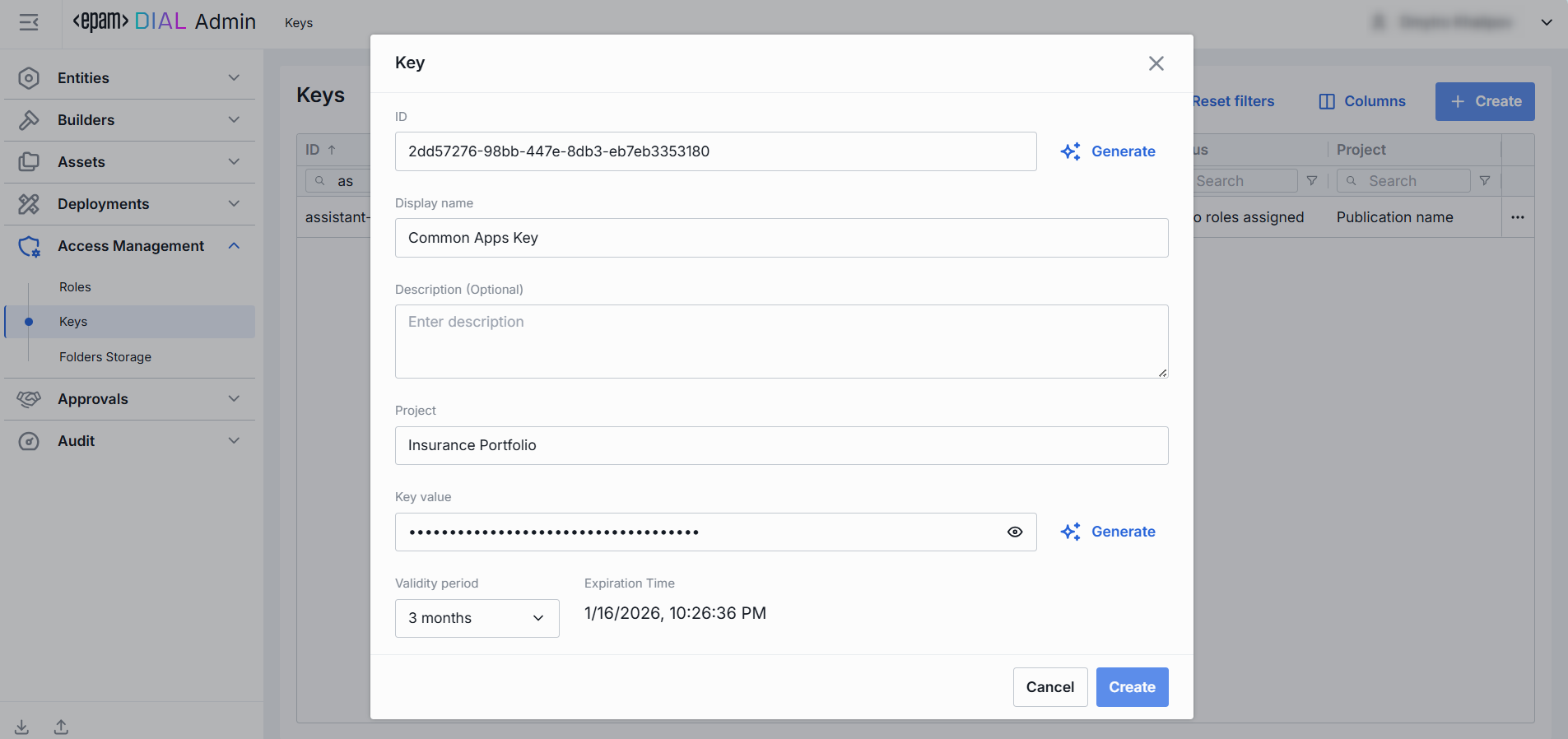 Field Required Description & Use Cases ID Yes A unique key under the Keys section of DIAL Admin. Click Generate to automatically create unique GUID. Display Name Yes A user-friendly name of the Key. Description No An optional free-form text.