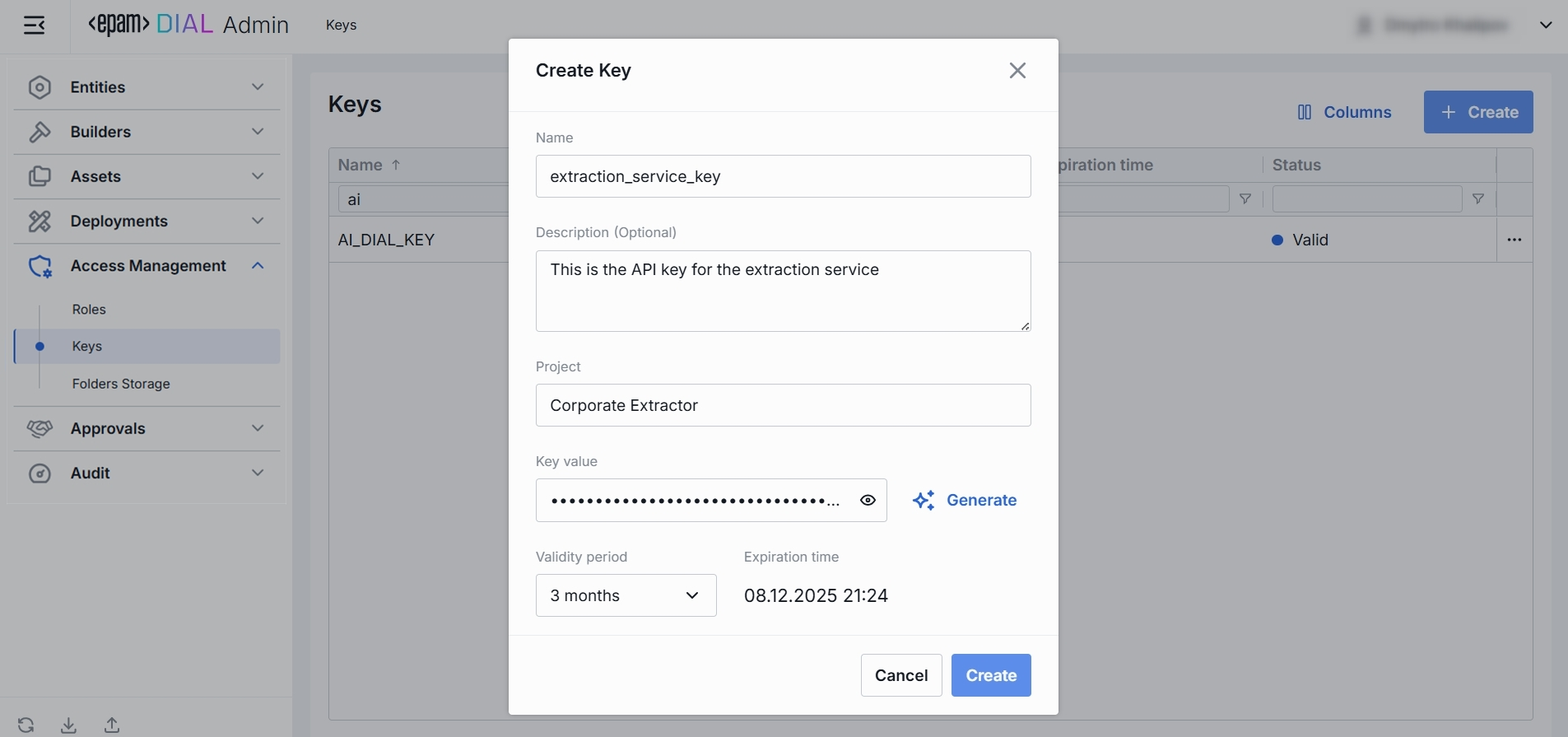 Press Generate to have its value automatically generated.Validity Period Yes A key's expiration time period. Use to enforce credential rotation and retirement. -