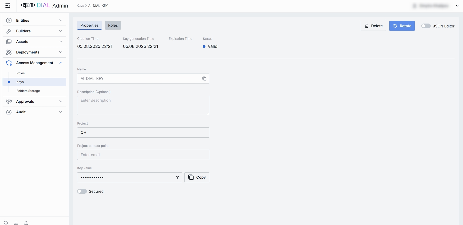 - Delete: Permanently removes the selected key. All related entities (applications, models, routes) bound to it may fail.