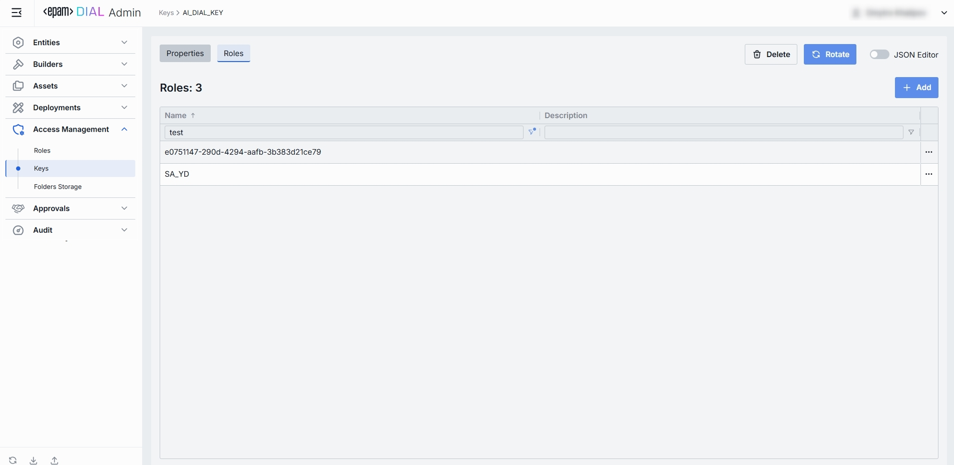 In the Roles tab, you can grant or revoke access to DIAL resources for API keys by associating them with roles. Only clients possessing this key and belonging to one of the assigned roles can invoke protected Models or Applications.