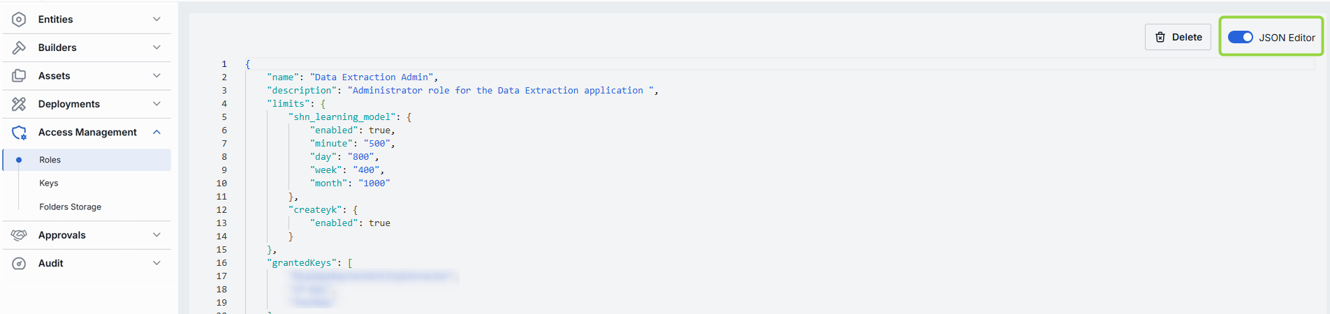 - JSON Editor (Toggle): Switch between the form-based UI and raw JSON view of the role's configuration. Use JSON mode for copy-paste or advanced edits.