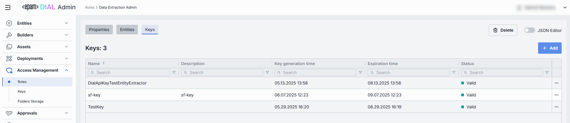 In the Keys tab, you can assign API keys for roles. API keys are defined in the Access Management → Keys section.