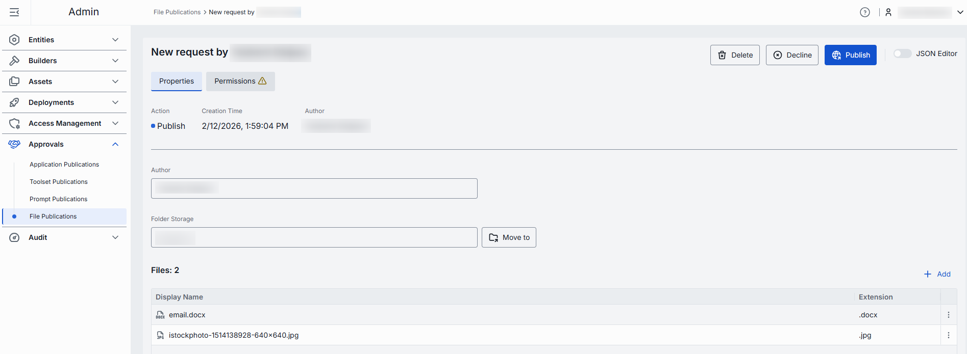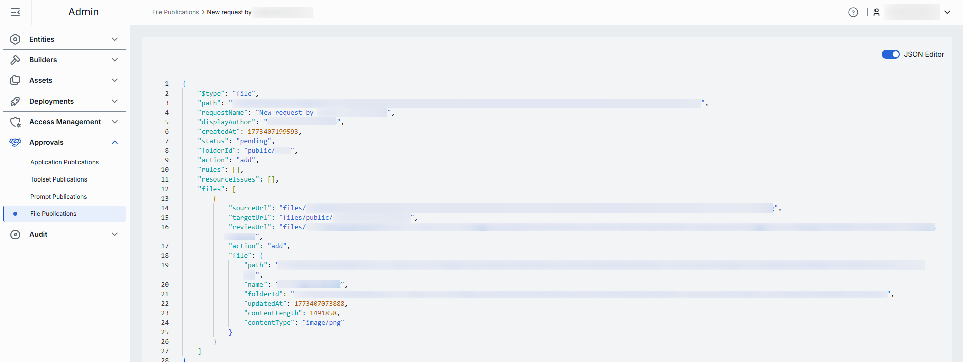 Advanced users with technical expertise can work with files and publication request properties in the UI or a JSON editor view modes. It is useful for advanced scenarios of bulk updates, copy/paste between environments, or tweaking settings not exposed on UI.