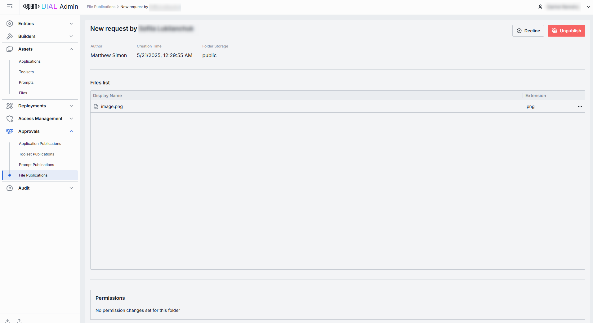 Click any publication request on the main screen to access the review page. On this page, you can inspect the selected request and decide whether to Publish, Unpublish or Decline it.