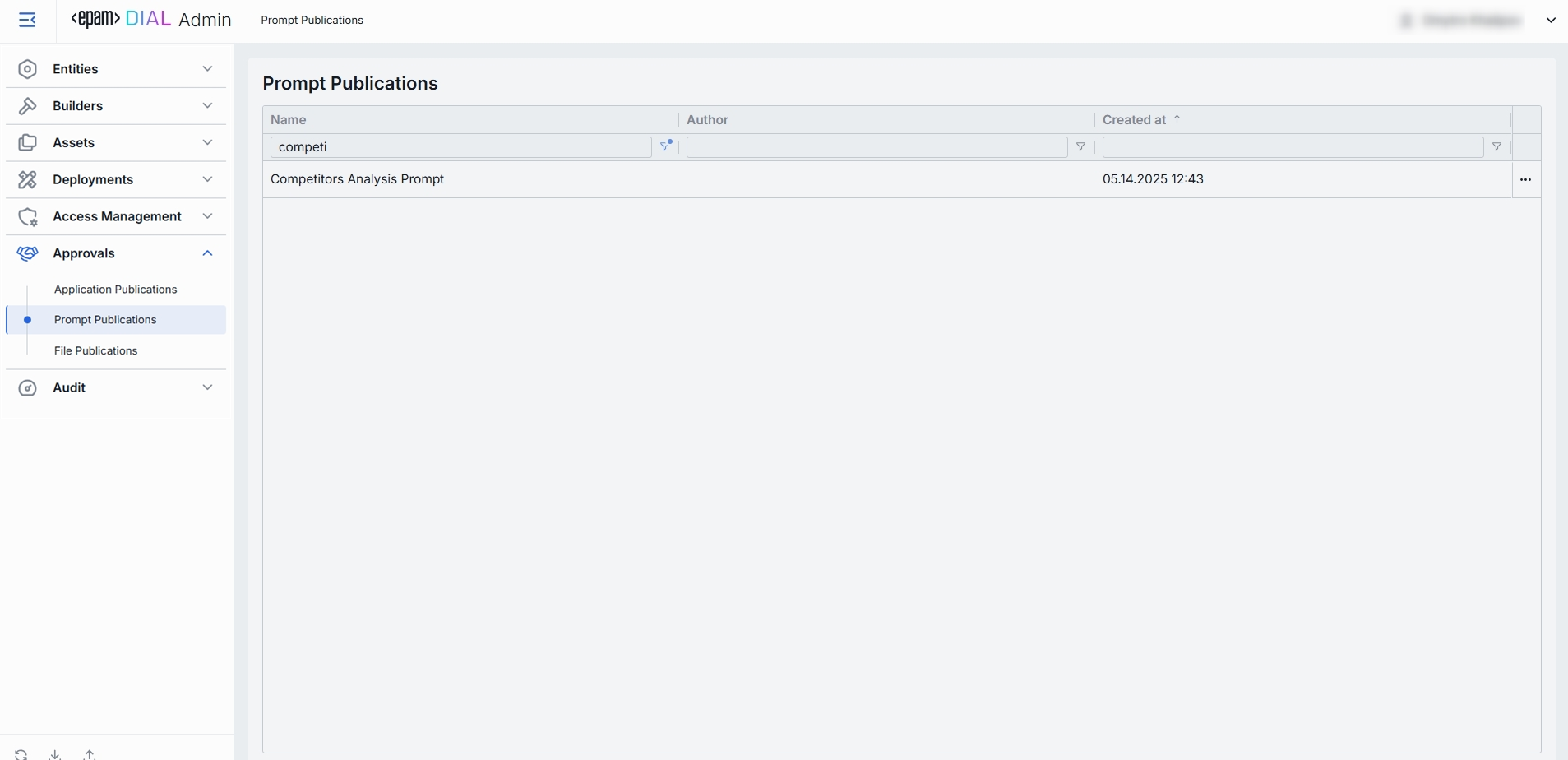 DIAL offers API for creating publication requests for resources, including prompts. In Prompt Publications, administrators can view and manage publication requests. Prompts from approved requests are available in Assets → Prompts.