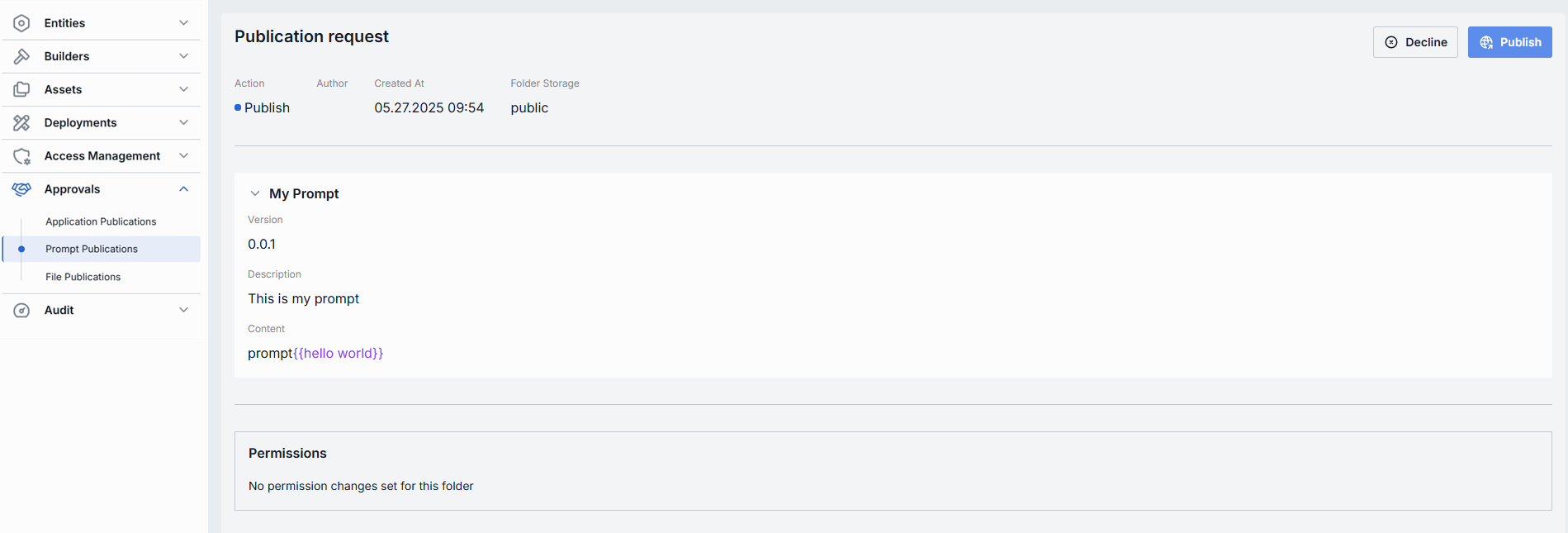 - Publish: Accept the publication request. This adds the prompt into the Assets → Prompts folder (under the specified Folder).