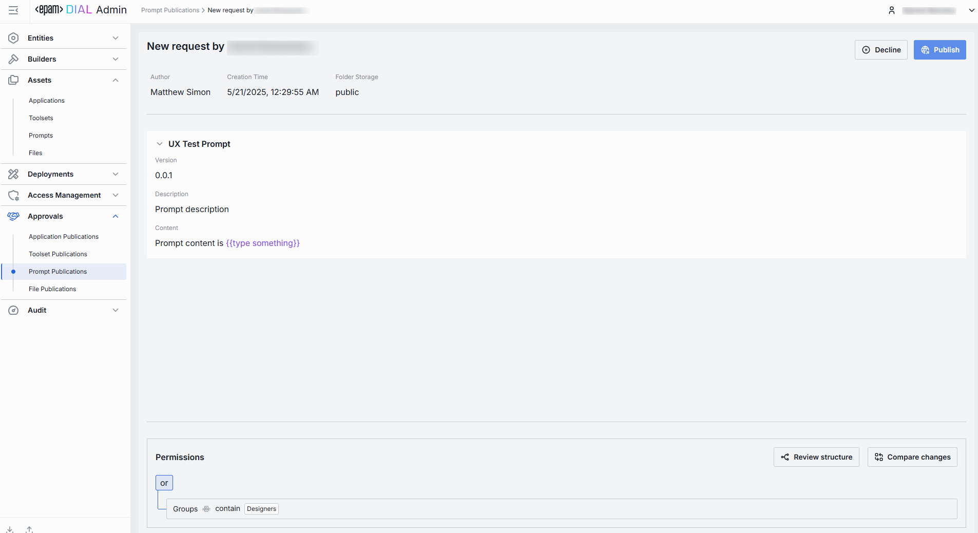 | Permissions | The proposed access rules to the published prompt (e.g., based on user group). Ensure the audience matches intended reach. If rules are not defined, the published resources will be available to all users. Available Controls: - Review structure opens a modal showing the storage folders tree and prompt's folder position in the hierarchy. - Compare changes side-by-side diff of current vs proposed permission rules to the prompt's folder. Use to verify and validate changes in access rules before approving the publication request. |