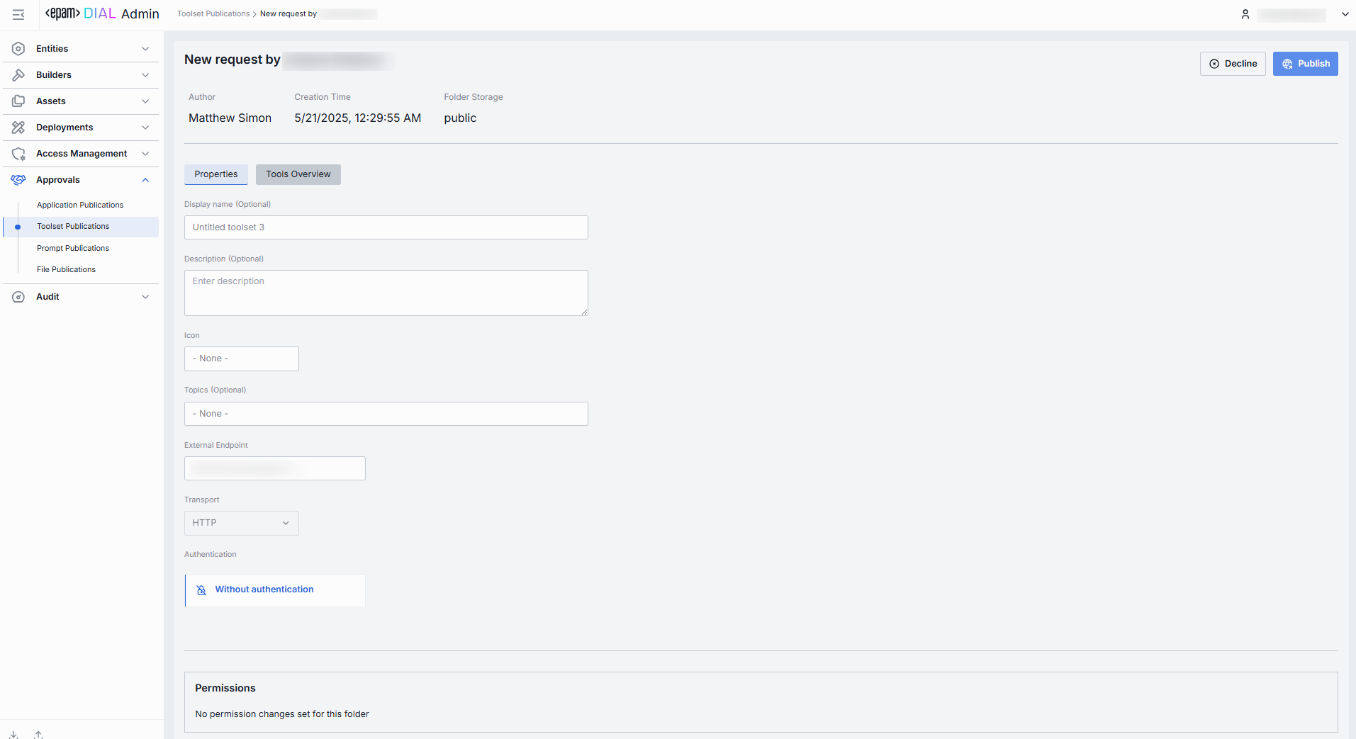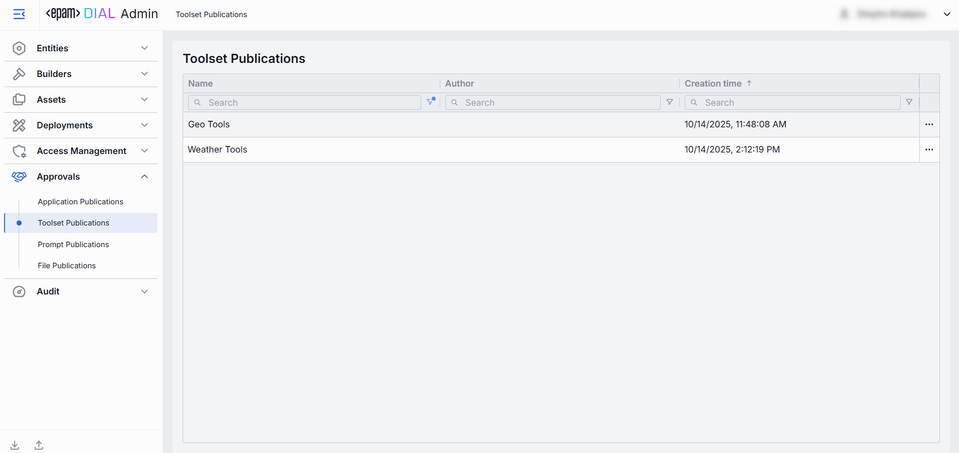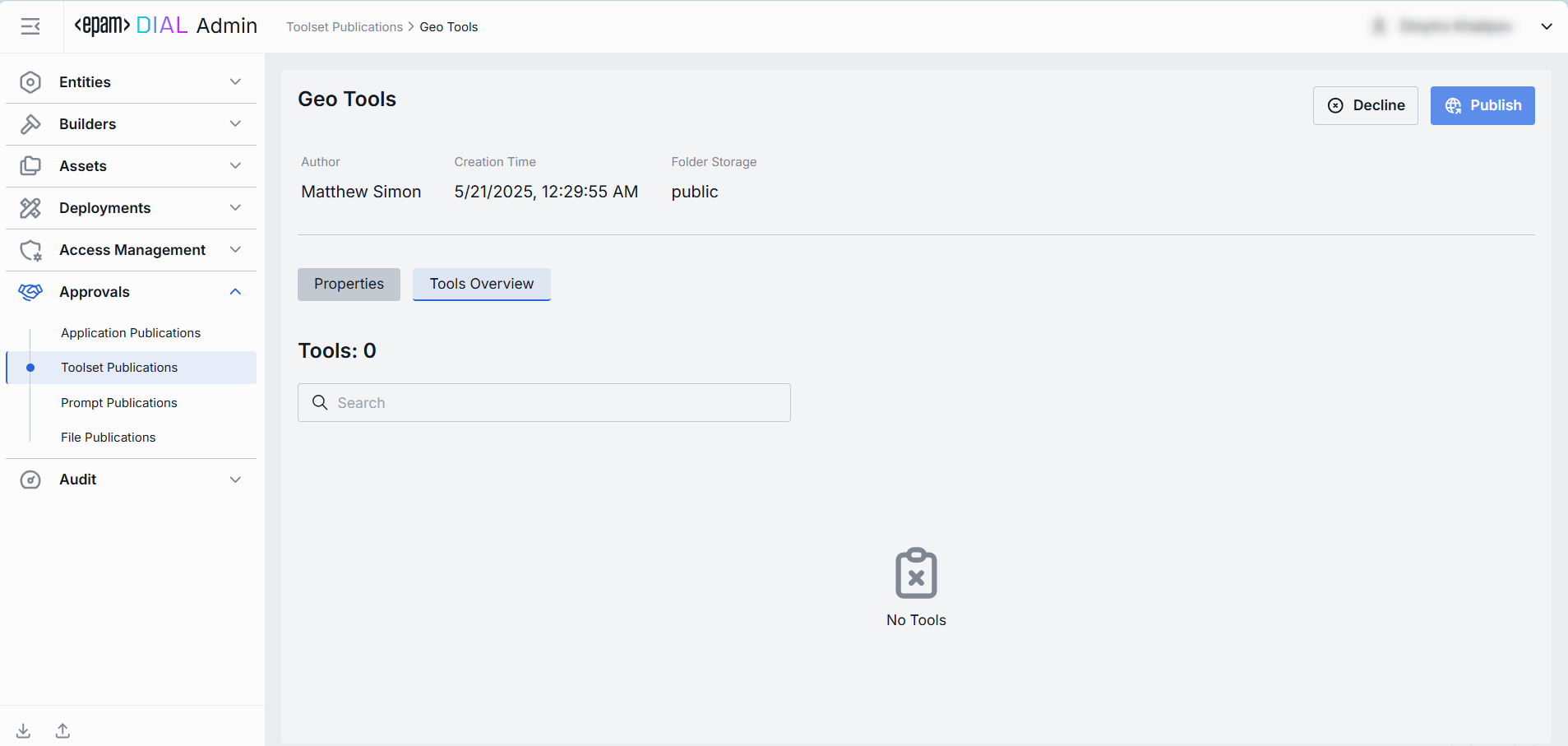 In this section of the DIAL Admin panel, admins can access and approve or decline toolsets publication requests.
