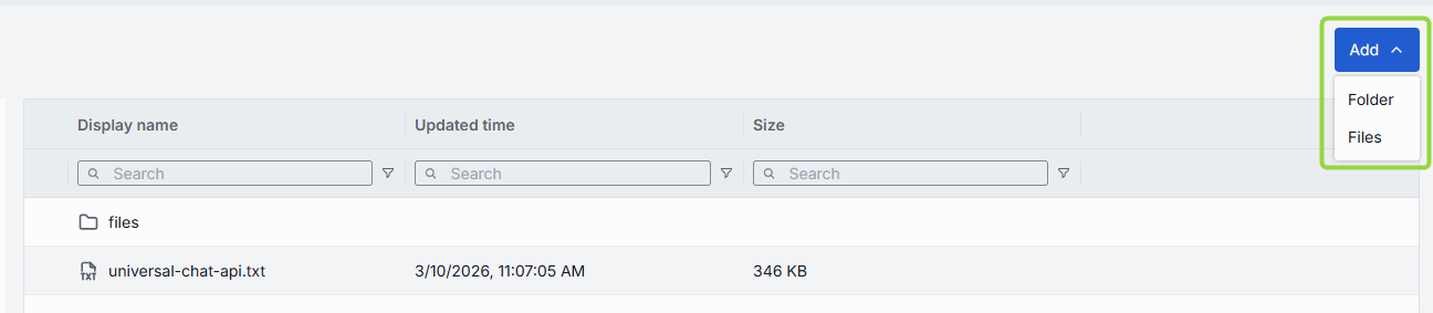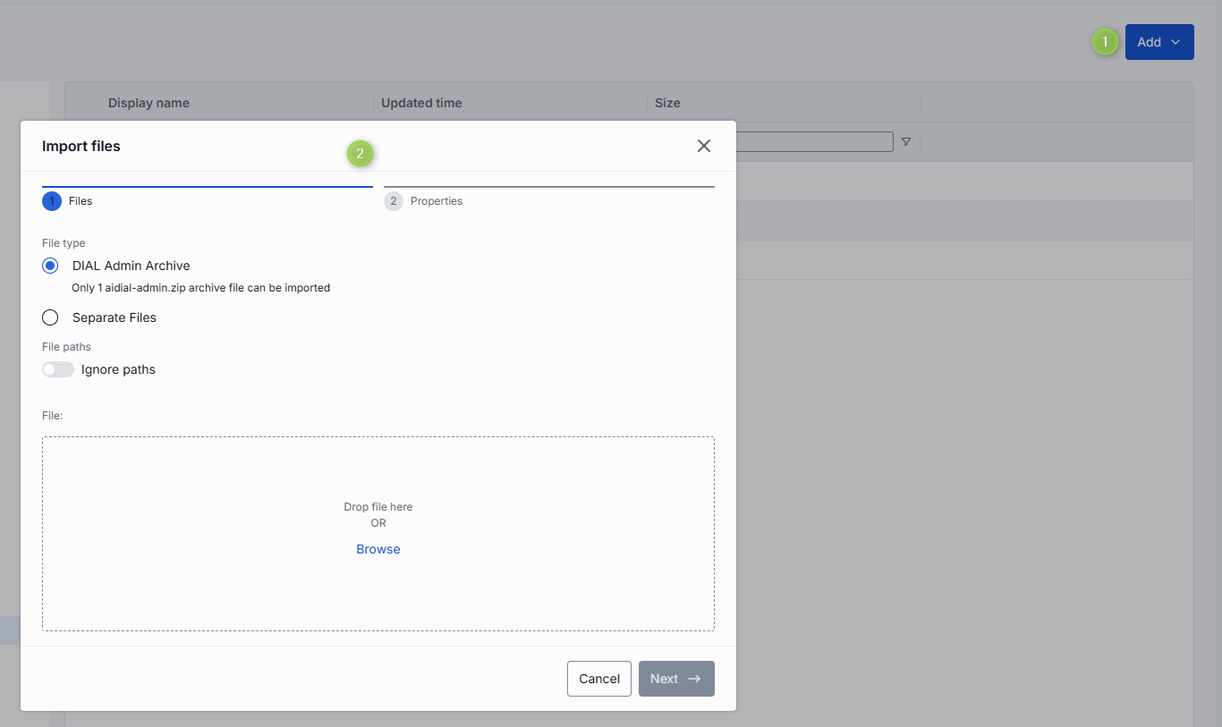 - Click Add in the toolbar and select Files to invoke the Import Files modal.