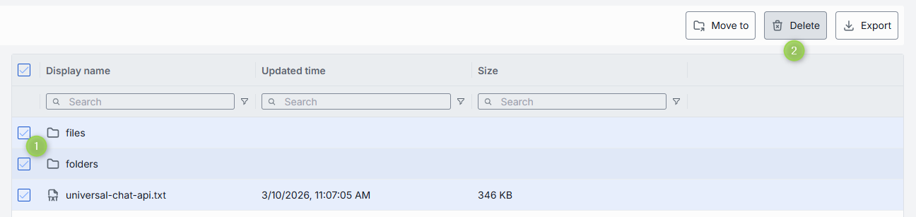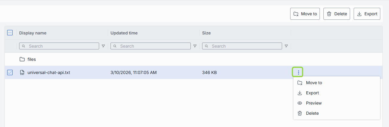 | Delete | Use to delete file(s). Note: Any models or applications that reference it will break until you reattach a valid file. |