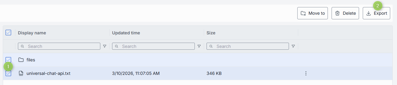 | Export | Use to download a ZIP archive with the selected file(s). |