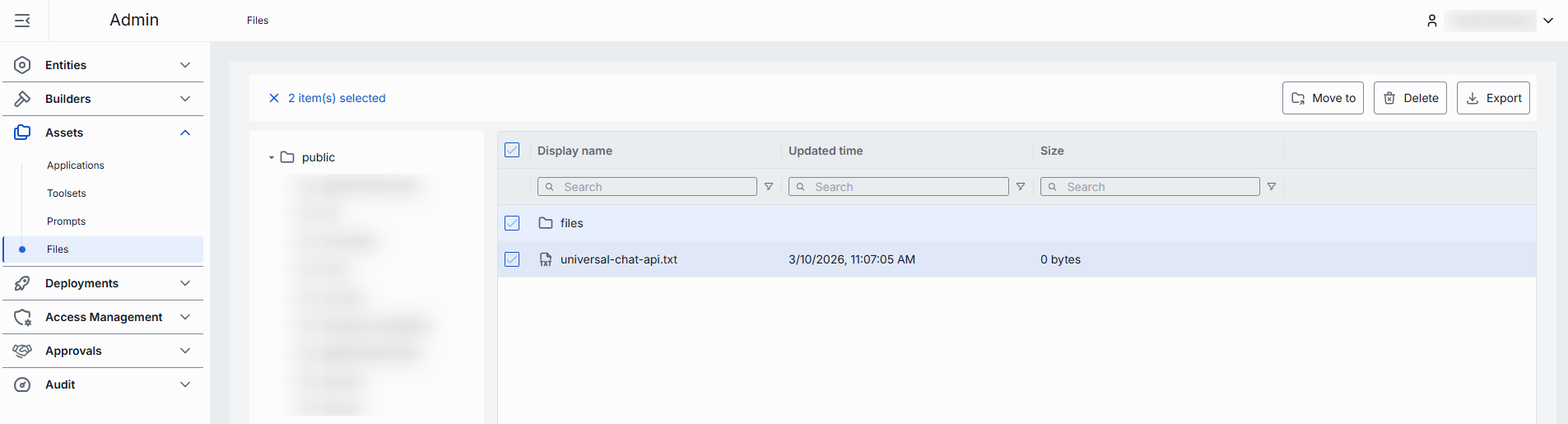 The Assets/Files screen displays all files located in the Public folder in DIAL file storage. Files get to the Public folder when published by users or added by administrators.