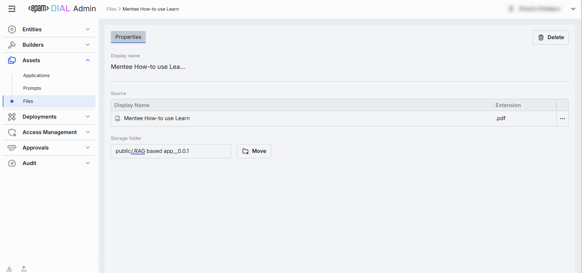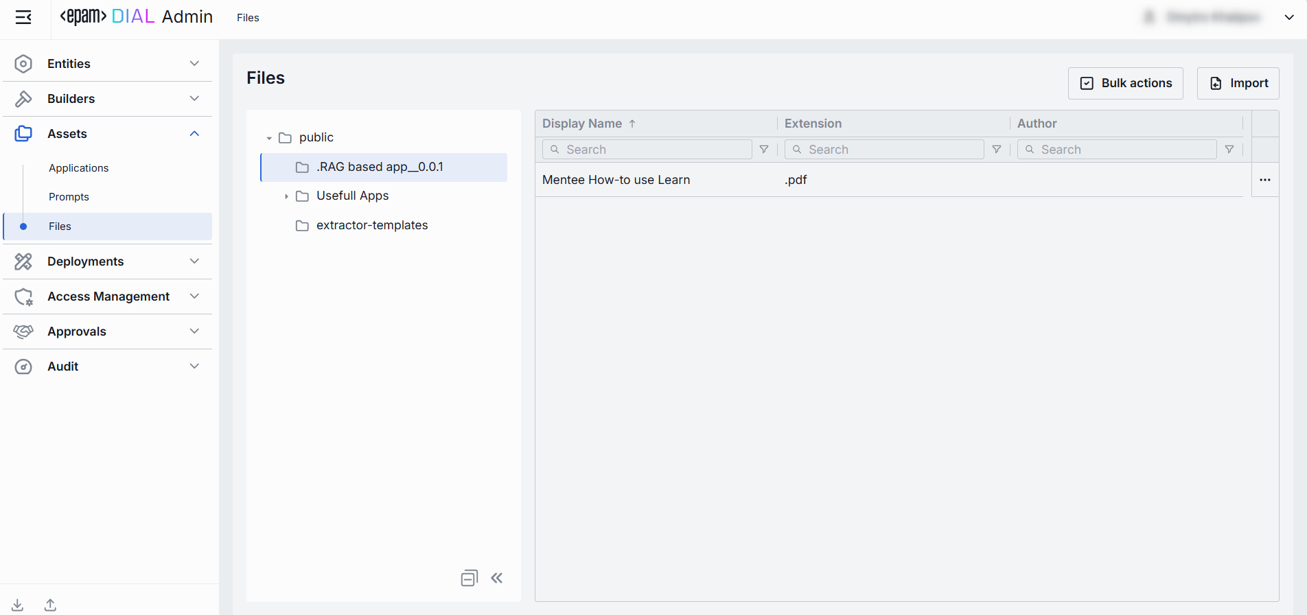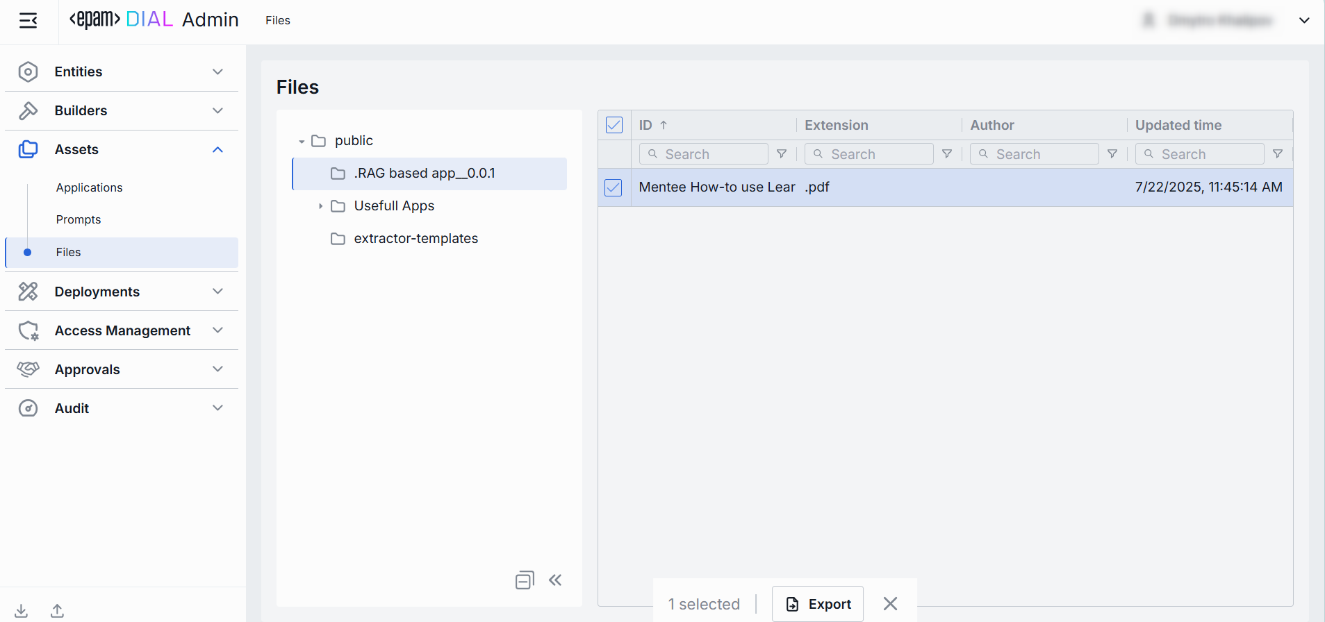 Use Bulk Actions in the toolbar to export files. This is helpful for backup, sharing, or migrating supporting assets alongside your DIAL configuration.