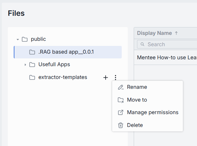 | Actions | Hover over any folder to view a context menu icon with actions you can perform in relation to the selected folder. - Rename: Use to rename the selected folder. - Move to: Use to select a target location in the hierarchy to move the selected folder. - Manage permissions: Redirects to Folder Storage to manage access to the folder. - Delete: Use to delete the folder with files inside it. |