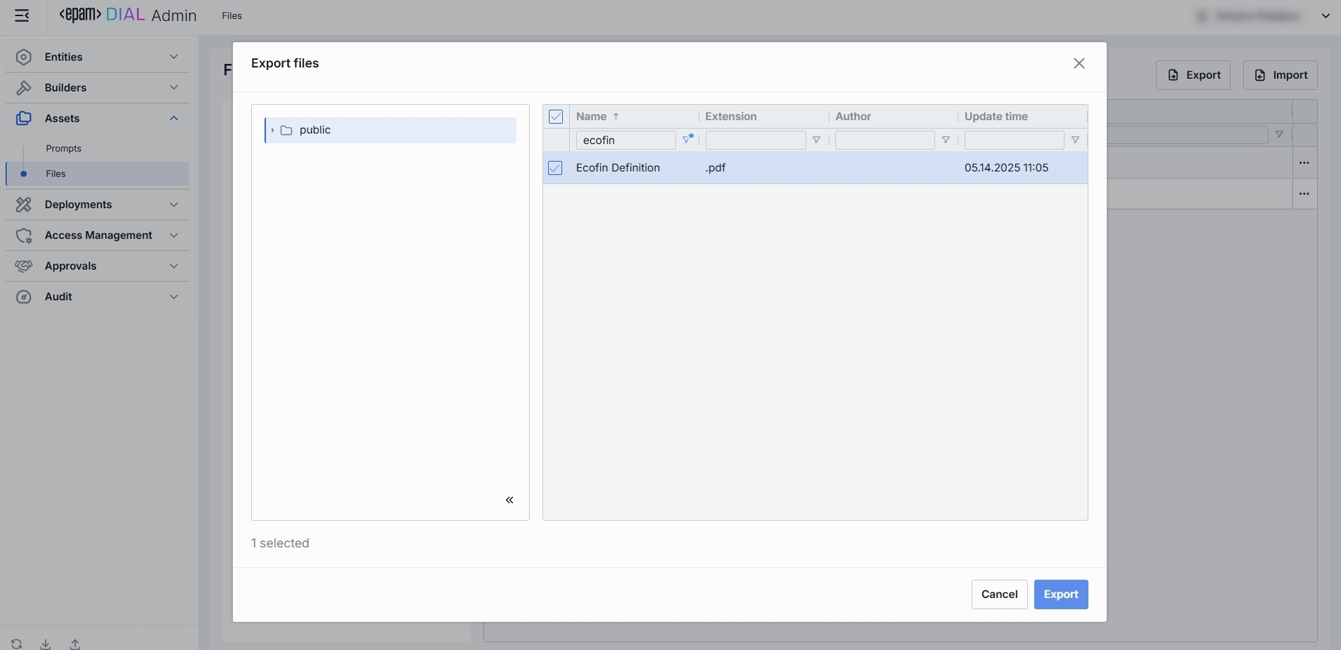 Use Export to bulk download files. This is helpful for backup, sharing, or migrating supporting assets alongside your DIAL configuration.