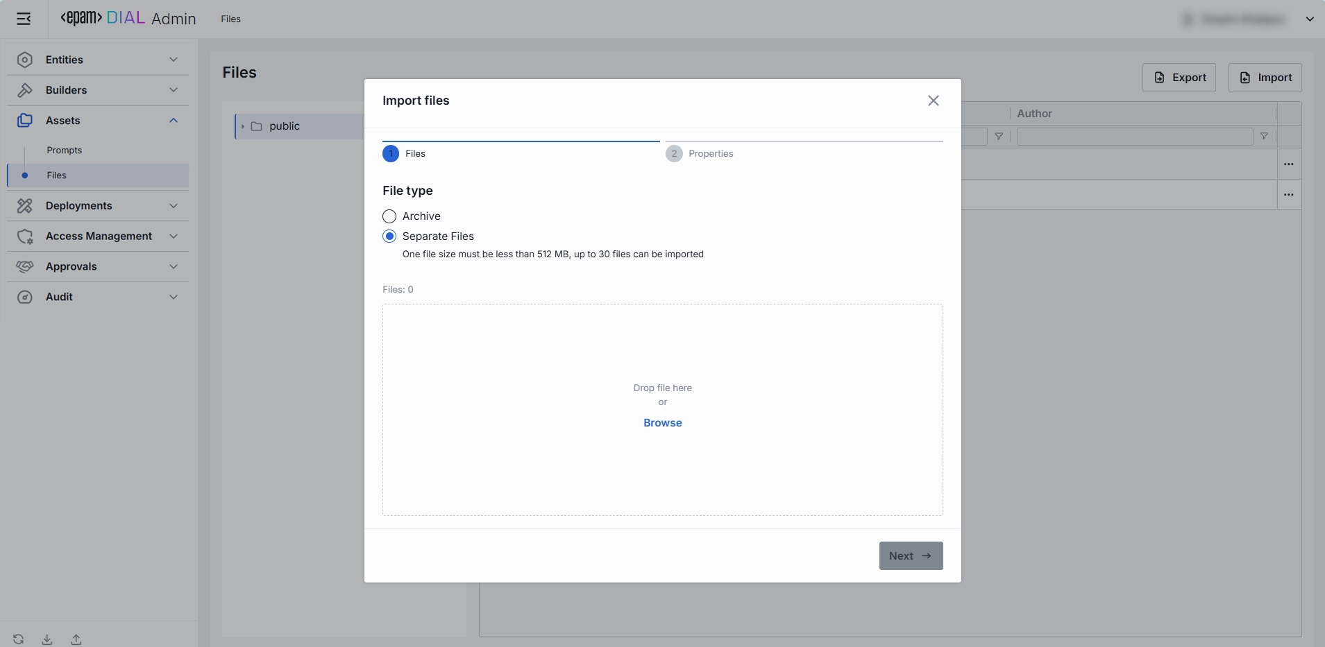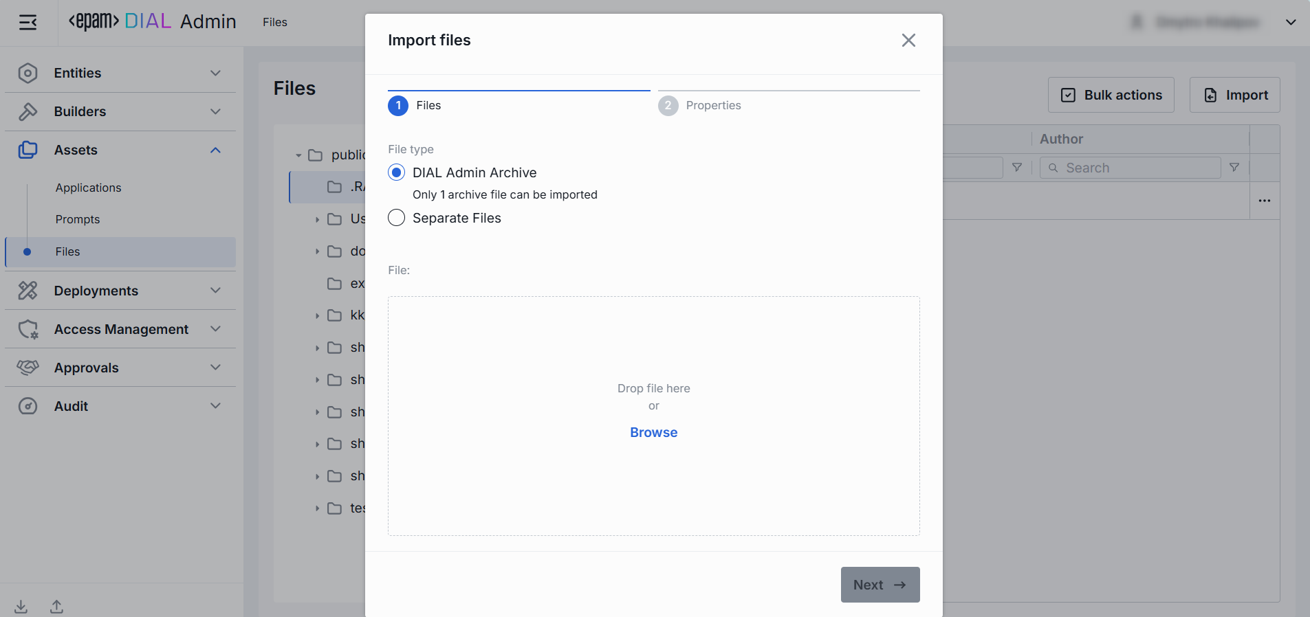 Select the type of files you want to import. Drag & drop files or an archive into the drop zone, or click Browse to open your local file browser.