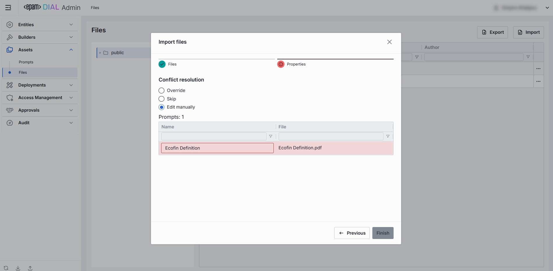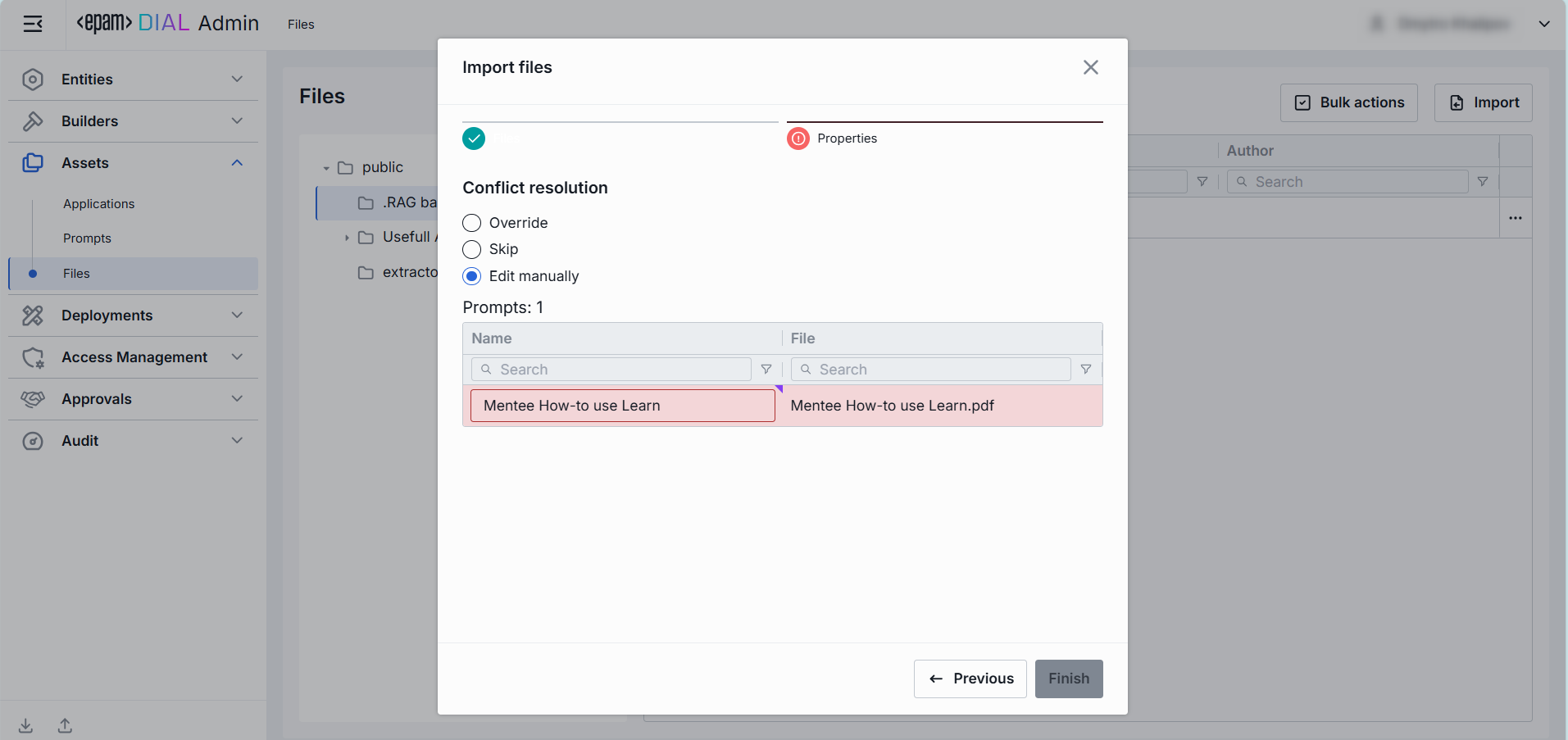 - Edit manually: Rename incoming files one by one to avoid conflicts. Each conflicting file is flagged with red color and becomes editable - update its Name to avoid conflicts.