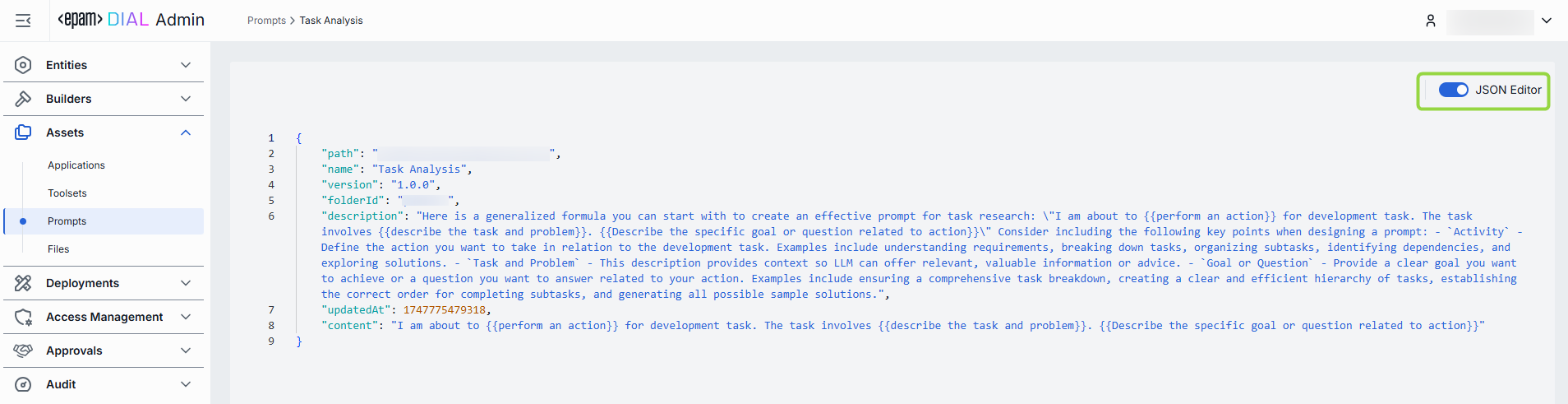 Advanced users with technical expertise can work with the prompt properties in a JSON editor view mode. It is useful for advanced scenarios of bulk updates, copy/paste between environments, or tweaking settings not exposed on UI.