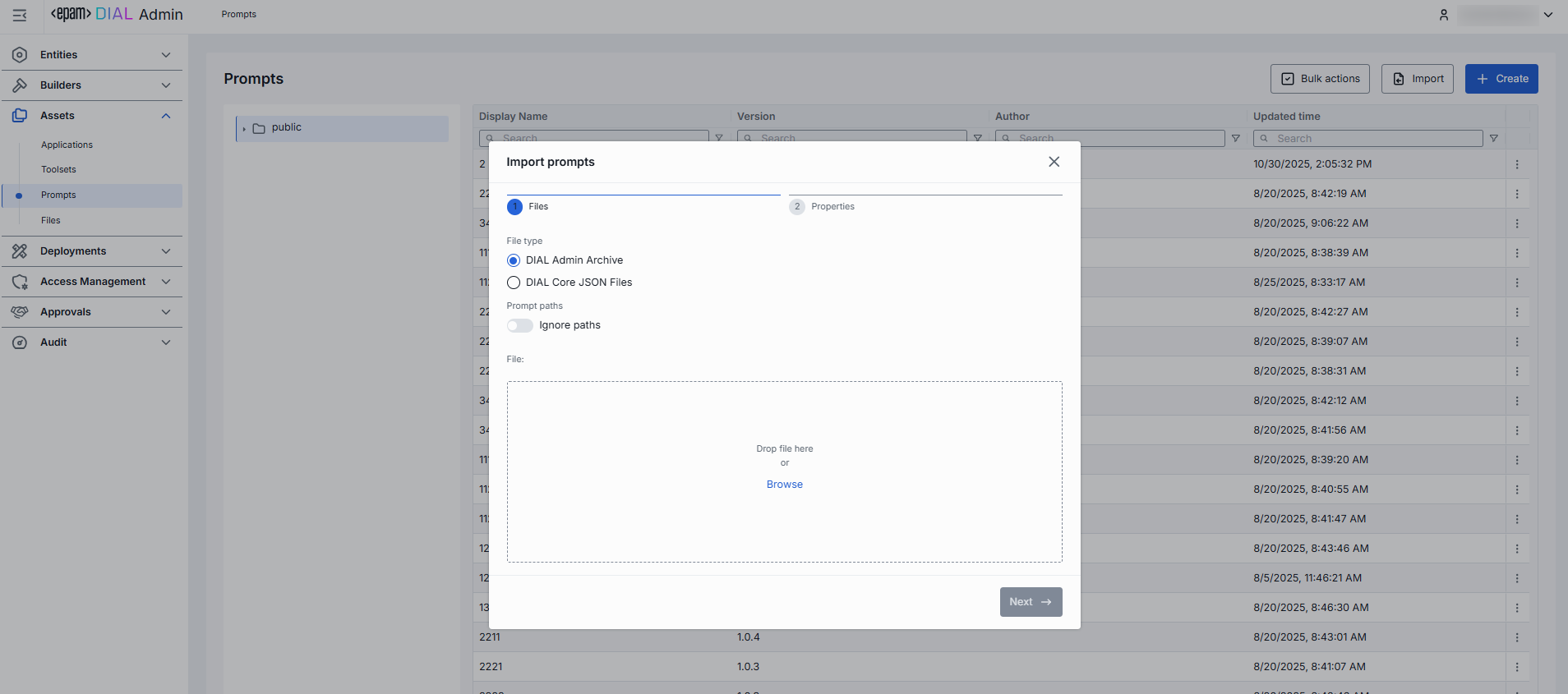 Use Import in the toolbar to upload new or update existing prompts from external JSON files or ZIP archive. This is essential for migrating, restoring, or sharing prompt assets between DIAL users.