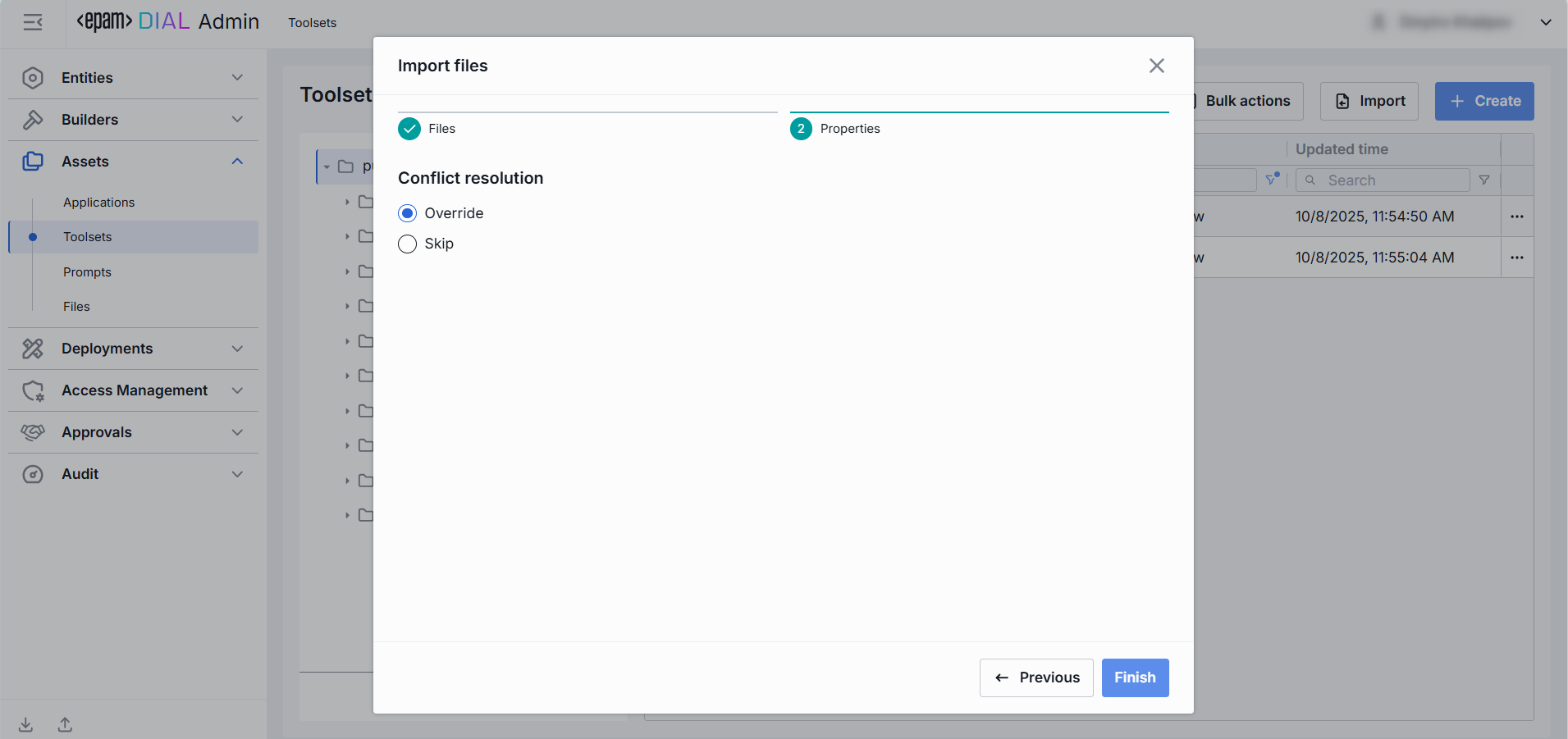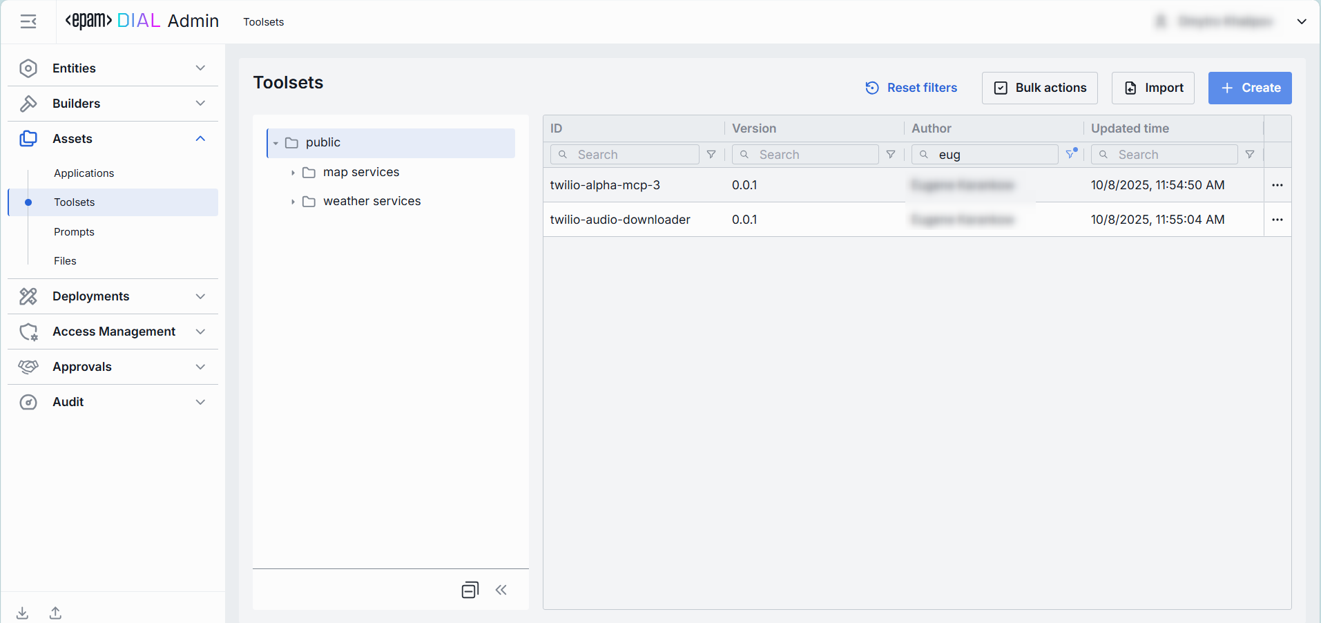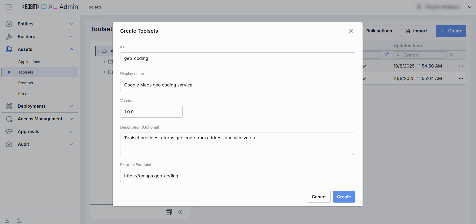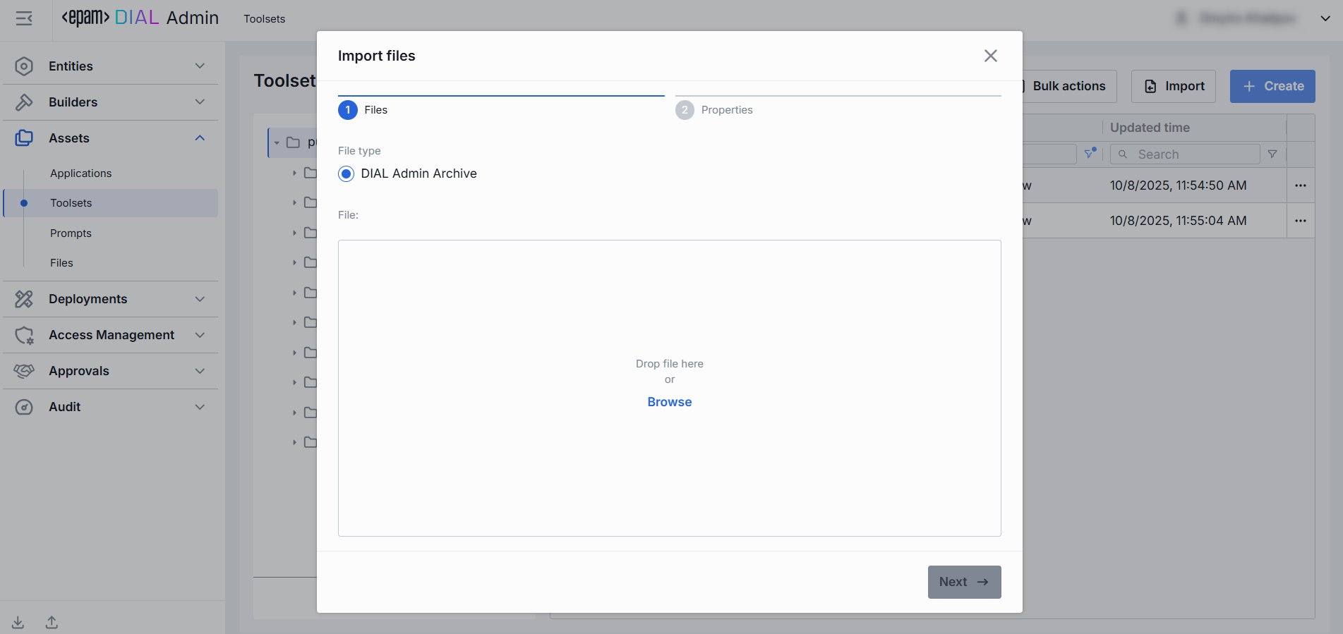 Use Import in the toolbar to upload new or update existing toolsets from ZIP archive. This is essential for migrating, restoring, or sharing toolsets assets between DIAL users.