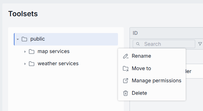 | Actions | Hover over any folder to view a context menu icon with actions you can perform in relation to the selected folder. - Rename: Use to rename the selected folder. - Move to: Use to select a target location in the hierarchy to move the selected folder. - Manage permissions: Redirects to Folder Storage to manage access to the folder. - Delete: Use to delete the folder with Toolsets inside it. |