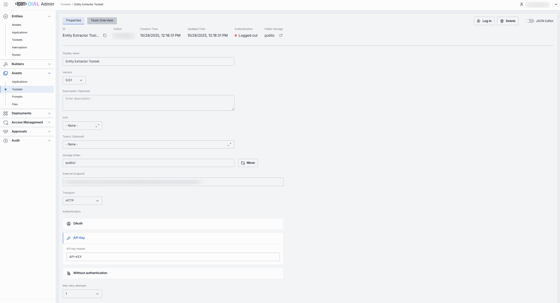 | Authentication | Authentication settings for the Toolset. Supported OAUTH, API_KEY, or NONE. Refer to DIAL Core to learn more about toolset authentication. |