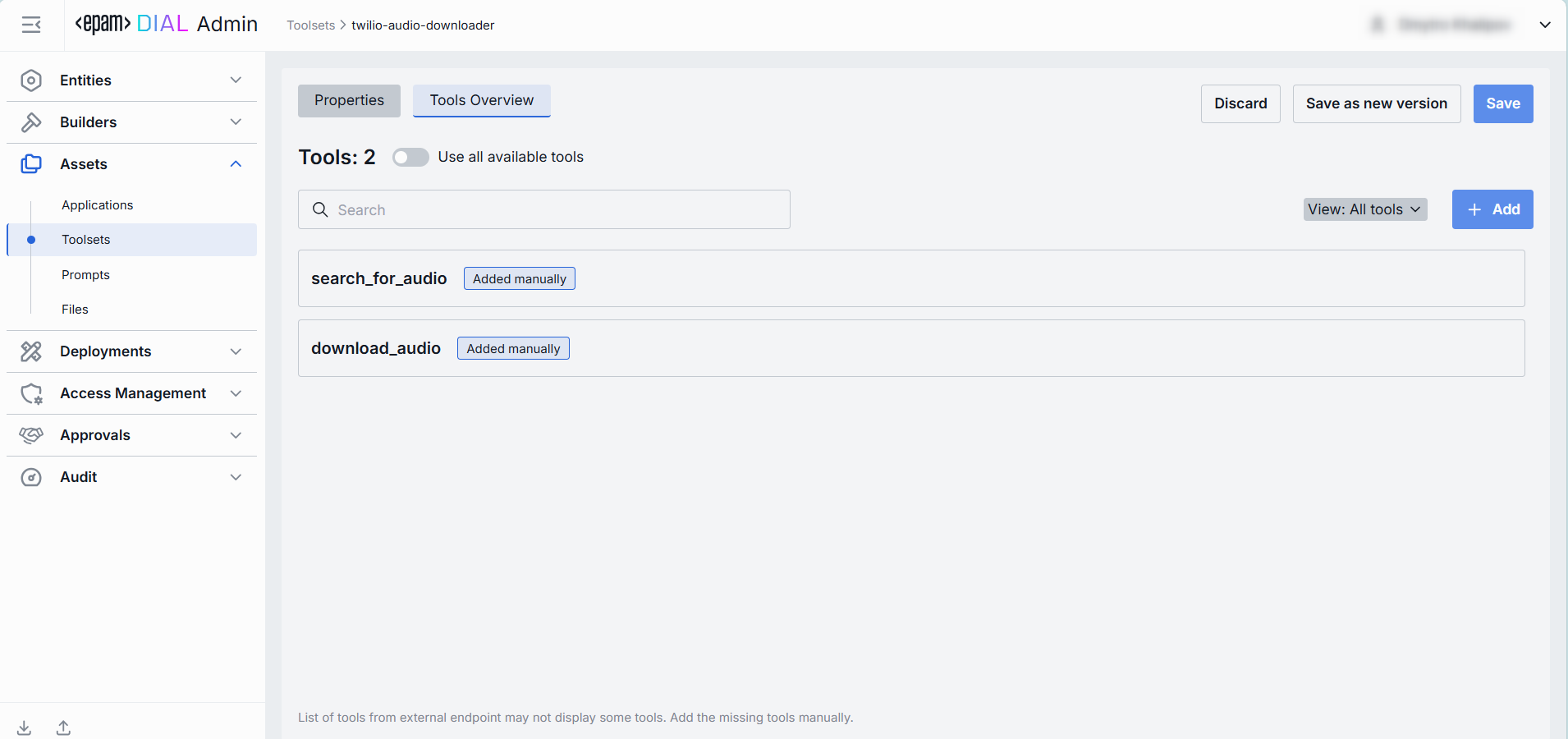 - Navigate to Assets → Toolsets, then select the toolset you want to edit.
