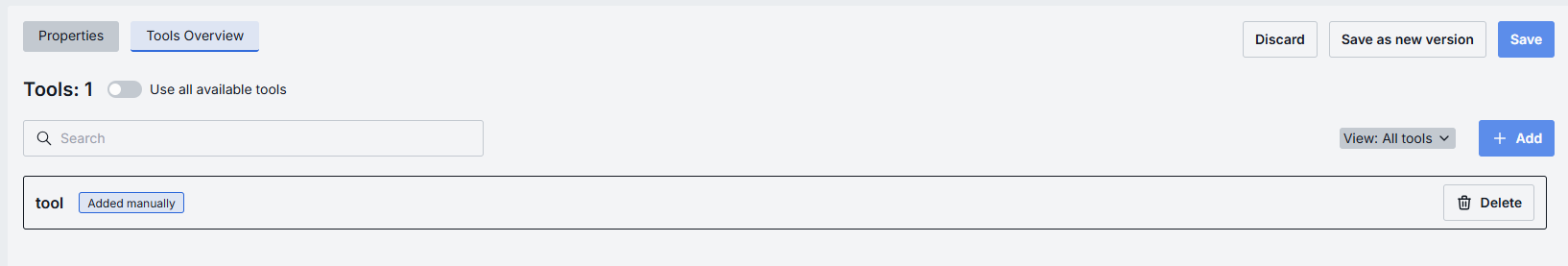 Tools in toolsets are functionalities supported by a corresponding MCP server that can be used to extend the capabilities of your toolset. In this tab, you can find all tools included in the toolset and add more tools.