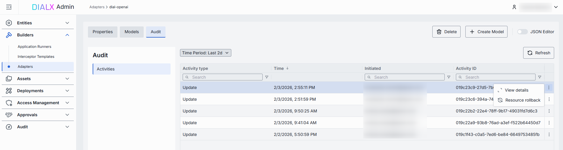 TIP: This section mimics the functionality available in the global Audit → Activities menu, but is scoped specifically to the selected AI model adapter.