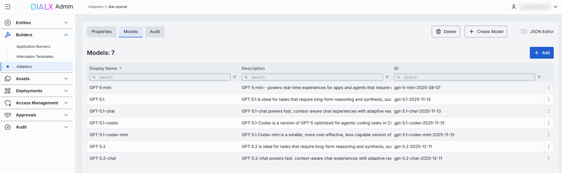 In the Models tab, you can view and add AI models exposed by the selected adapter.