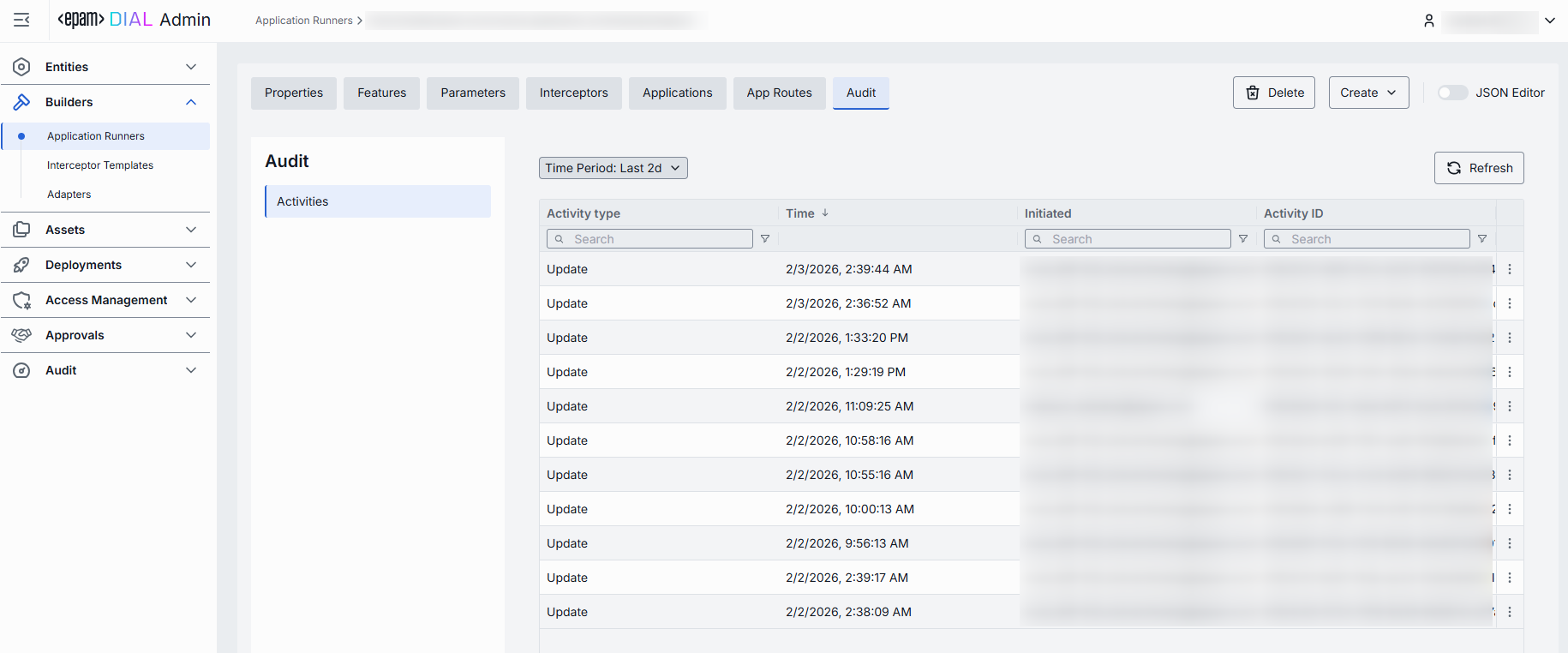 TIP: This section mimics the functionality available in the global Audit → Activities menu, but is scoped specifically to the selected application runner.