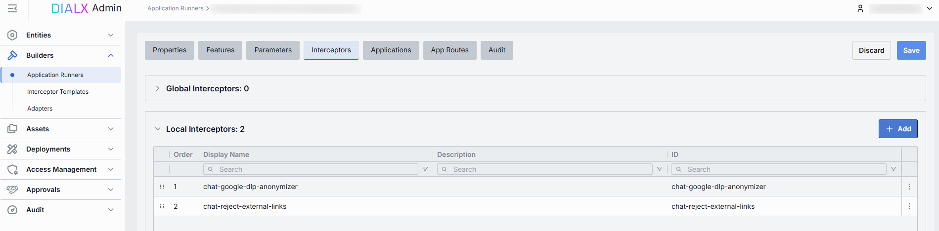 In the Interceptors tab, you can add local interceptors that will process requests and responses for applications built on this runner. Such interceptors will be displayed as runner interceptors in the configuration of application created based on the selected application runner.