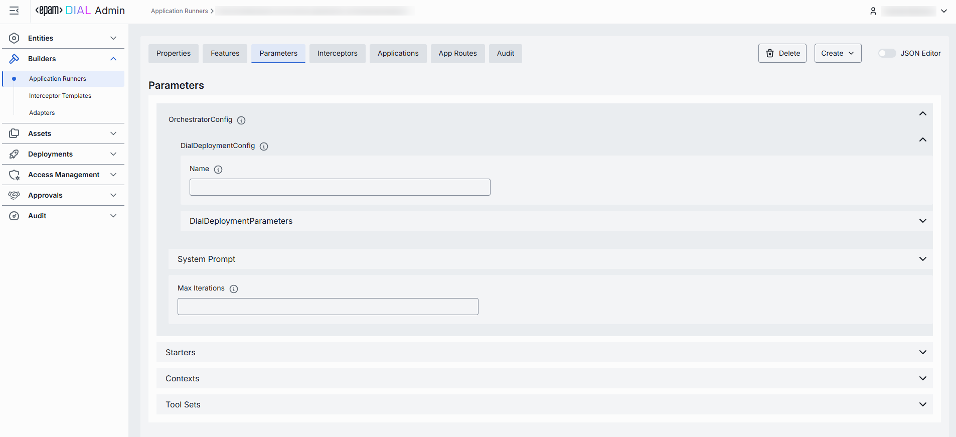 By editing the configuration in the Parameters tab, you define parameters that must be configured to create an instance of application based on the selected Application Runner. The content of this screen is defined by required properties of the JSON schema of the Application Runner which you can access in JSON Editor.