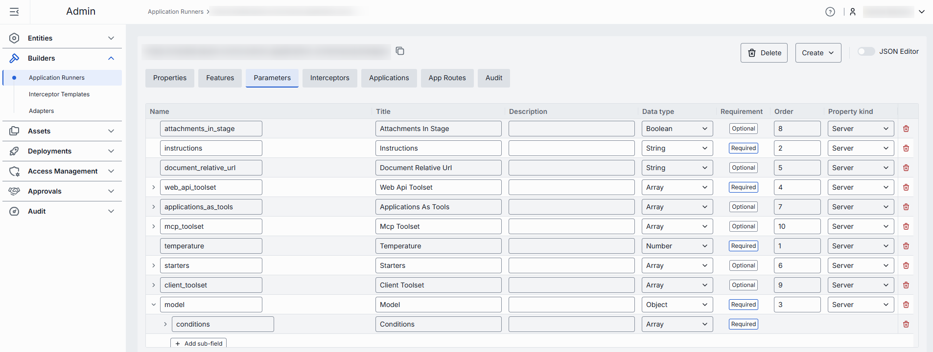 This section displays parameters of JSON schema of a specific application type. Here, you can define parameters that must be configured to create an instance of application based on the selected Application Runner.