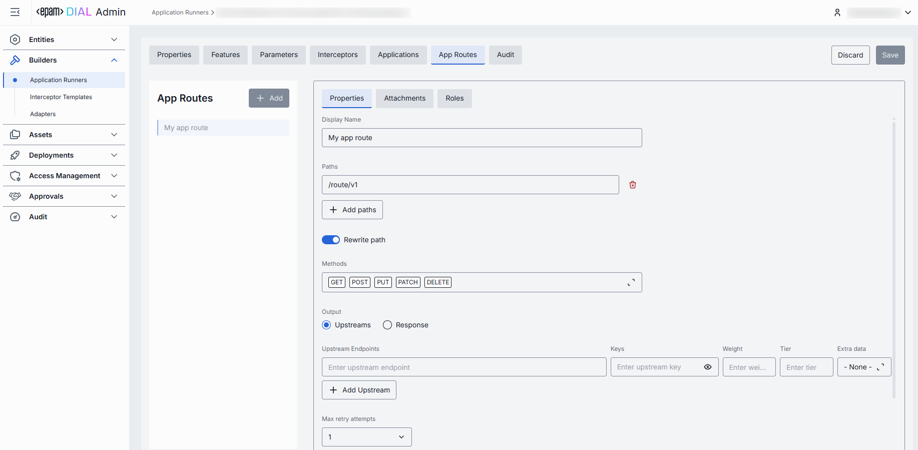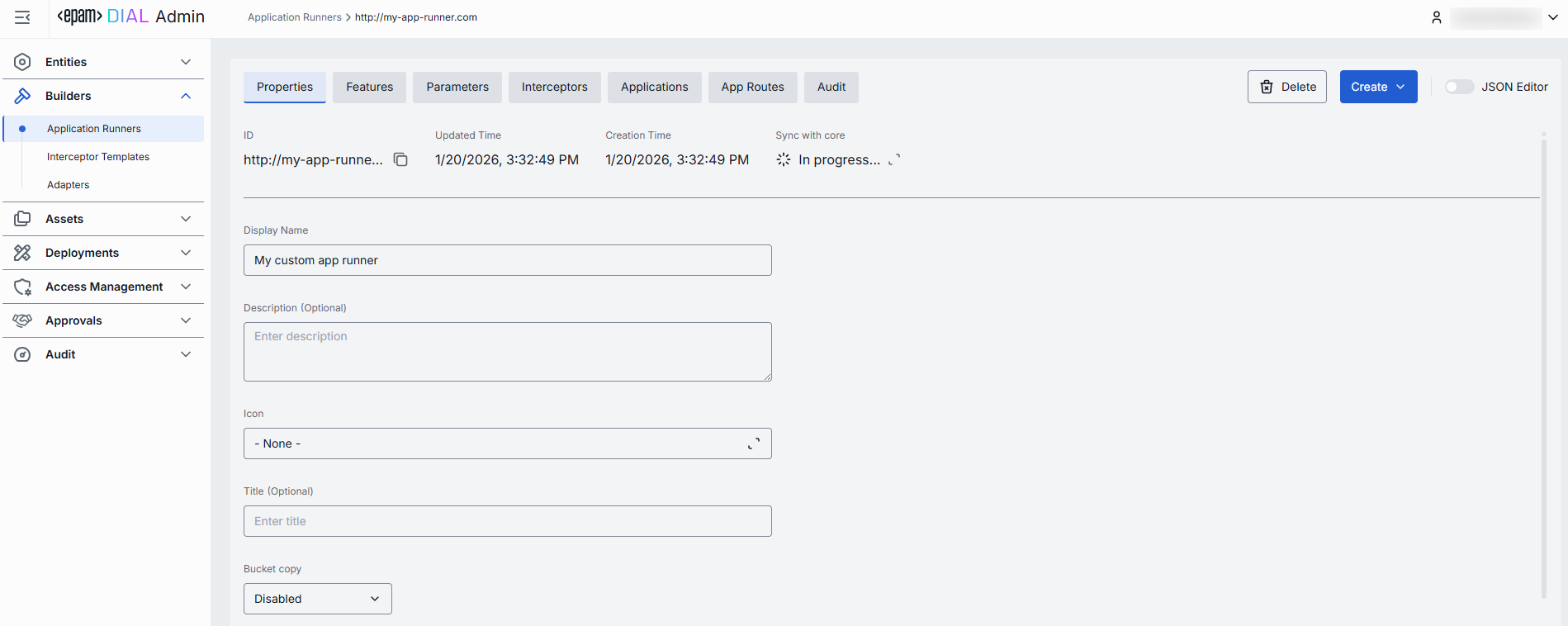 In the Properties tab, you can configure the core identity, metadata, and integration endpoints for your application runner. This includes settings that control how DIAL Core routes requests, how the runner appears in the UI, and how applications built on this runner interact with end users.
