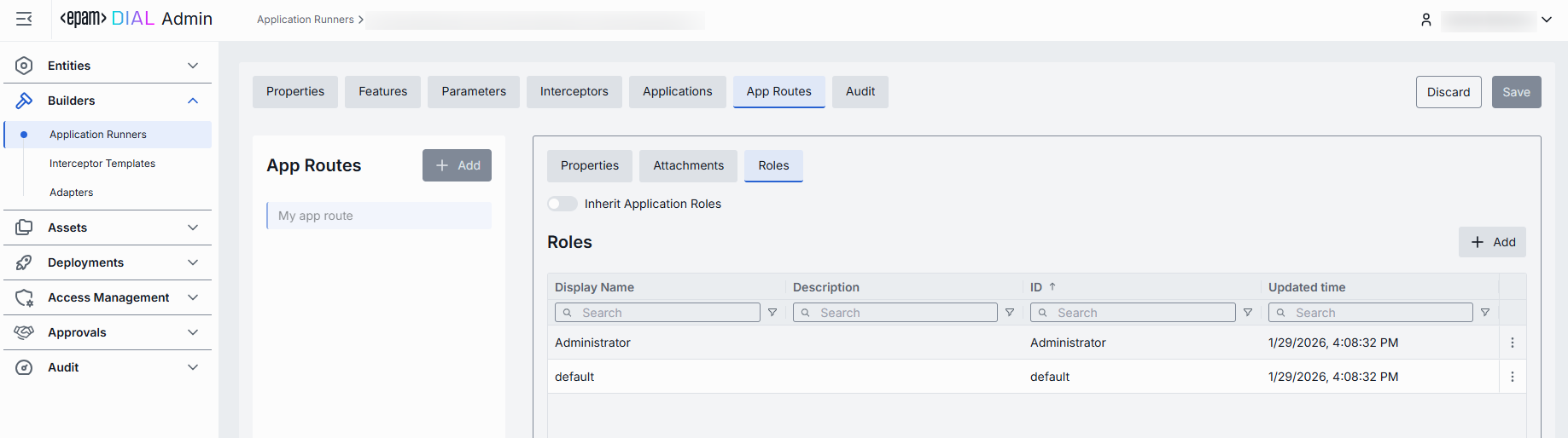 Use Inherit Application Roles toggle to apply roles assigned to an application which is built based on the selected application runner.