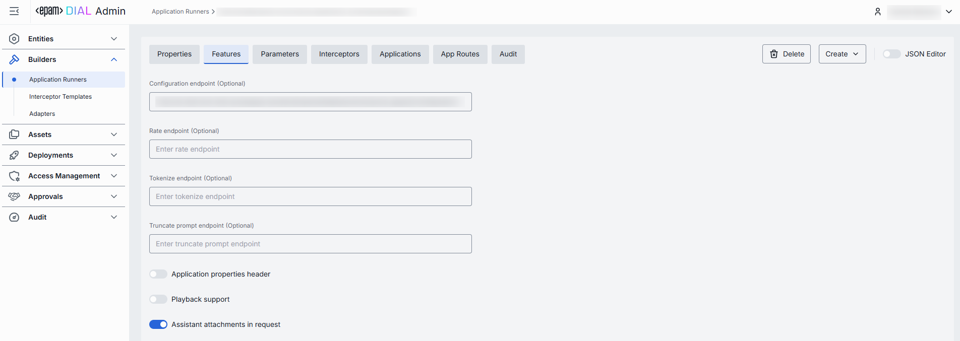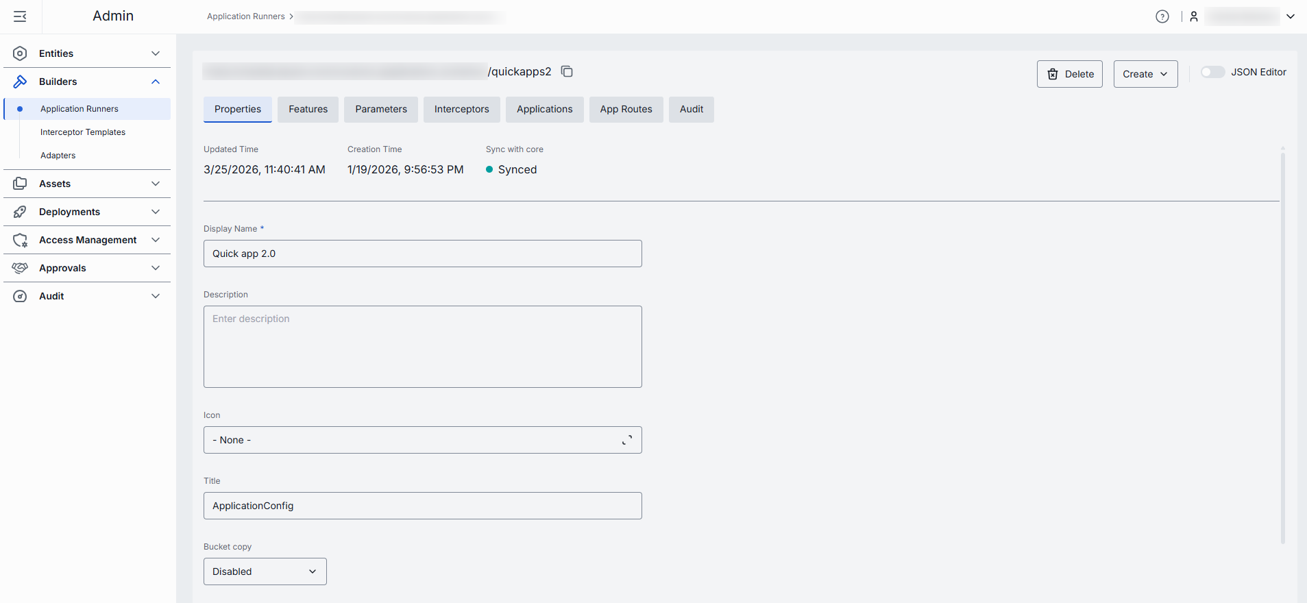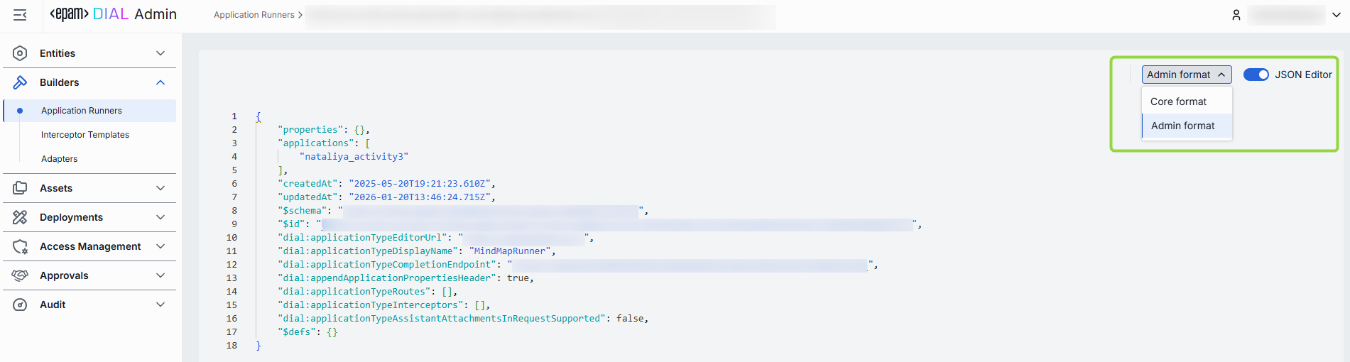 Advanced users with technical expertise can work with the JSON schema of the application runner in a JSON editor view mode. It is useful for advanced scenarios of bulk updates, copy/paste between environments, or tweaking settings not exposed on UI.