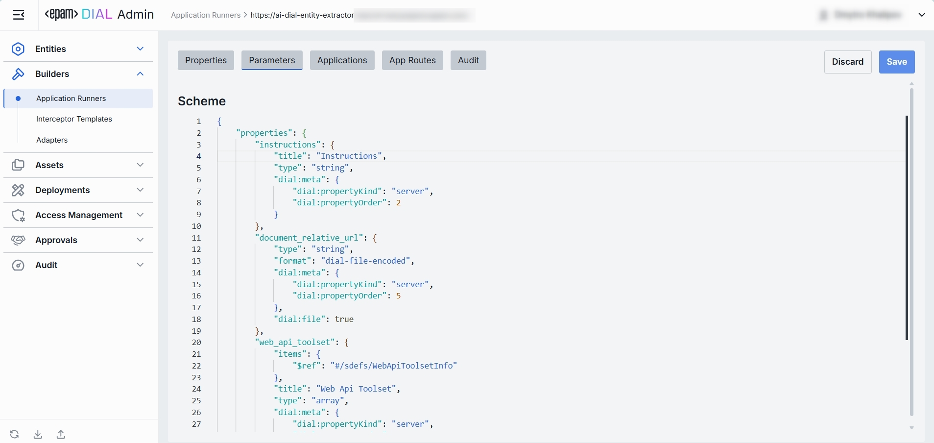 In the Parameters tab, you can configure how DIAL Core interacts with your runner's service (its endpoints) and specify which parameters from the ApplicationTypeSchema it should handle. This configuration allows DIAL to validate inputs, document, and render input forms for any application linked to this runner.