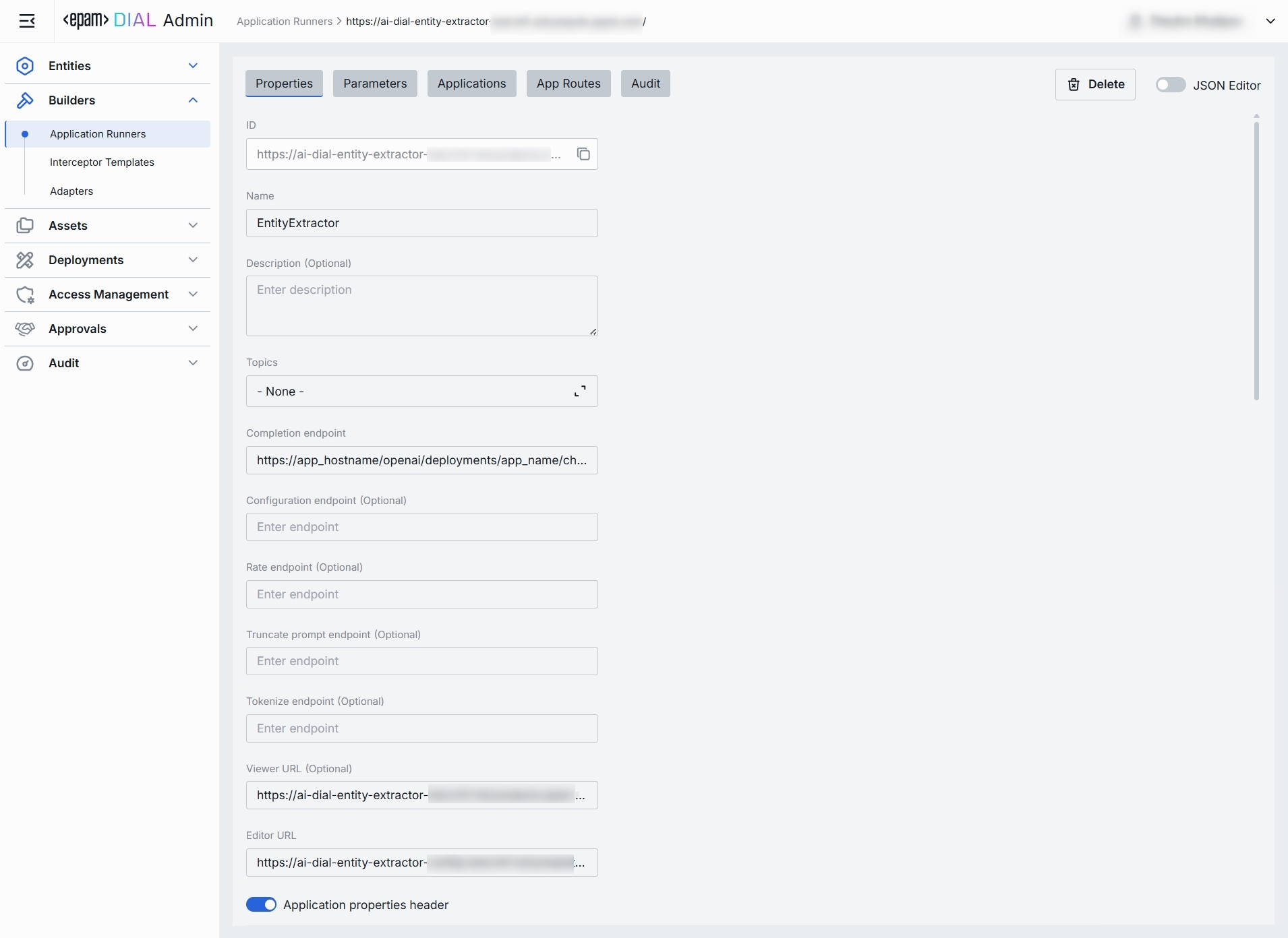 In the Properties tab, you can define identity and metadata of application runners - so DIAL Core knows where to send orchestration payloads and how to present this runner on the UI.