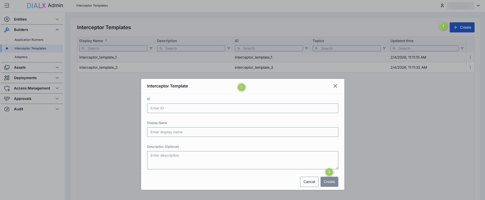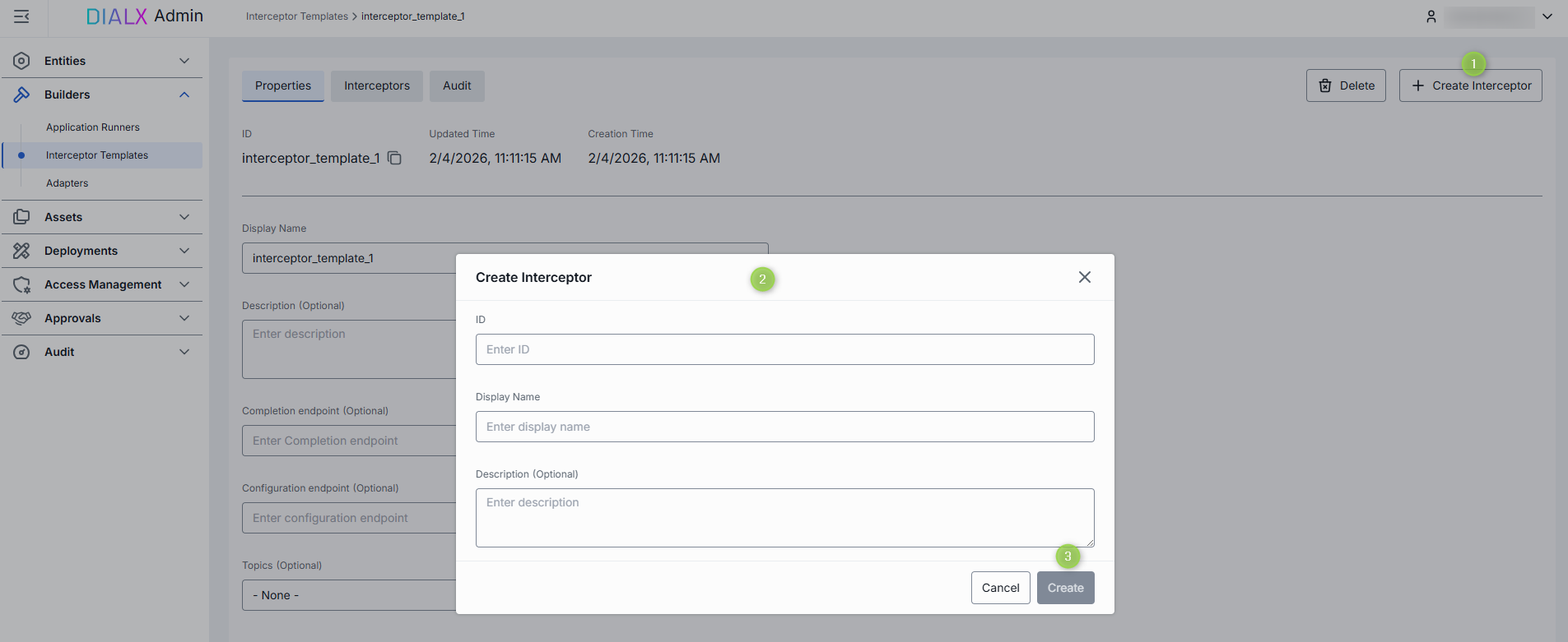 Click + Create to invoke the Interceptor Template modal.