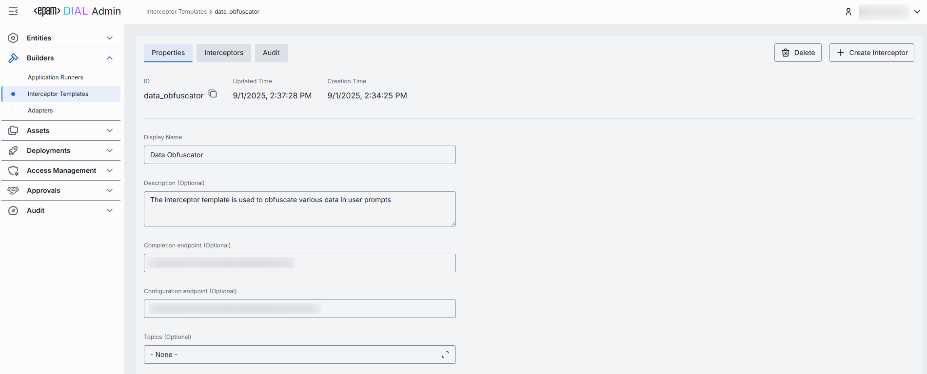 - Click Create to apply. The configuration of the new interceptor entity opens up. You may notice, that the template used is pre-populated in the Interceptor Template field.