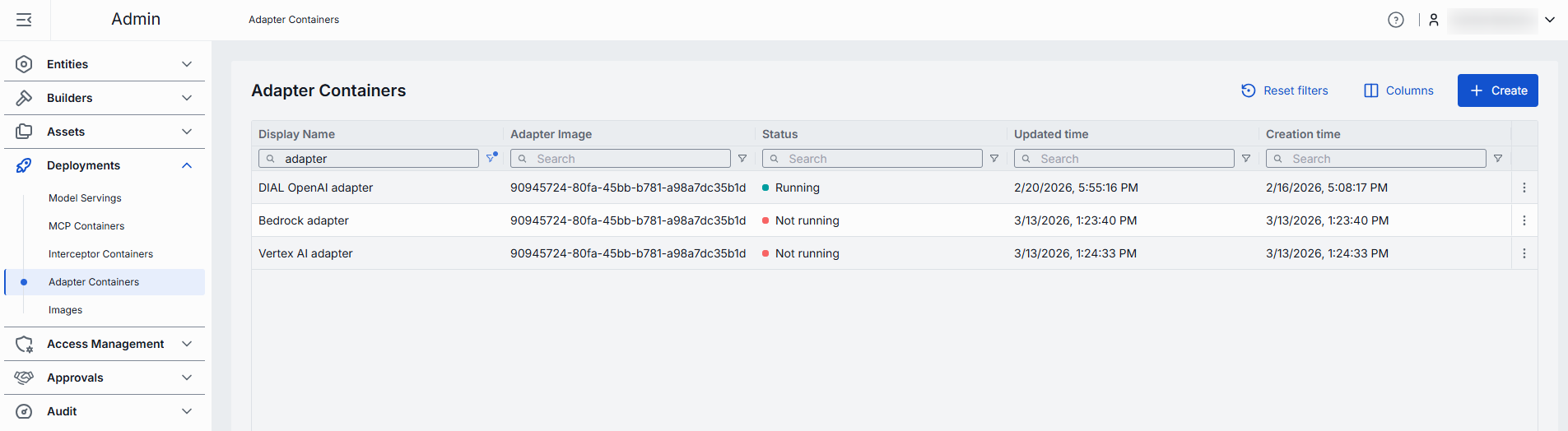 | Create Adapter | Available for running containers. Click to create a new adapter using this selected container. |