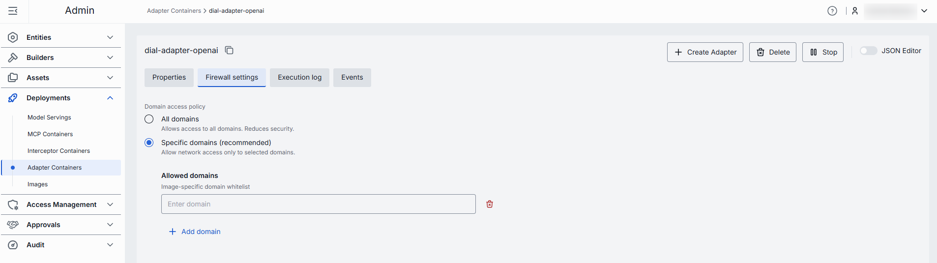 The whitelist domains settings specify which external domains the container is allowed to connect to. This setting controls outgoing traffic from the container, ensuring that it can only communicate with trusted domains (for example, your company’s website or specific client applications).