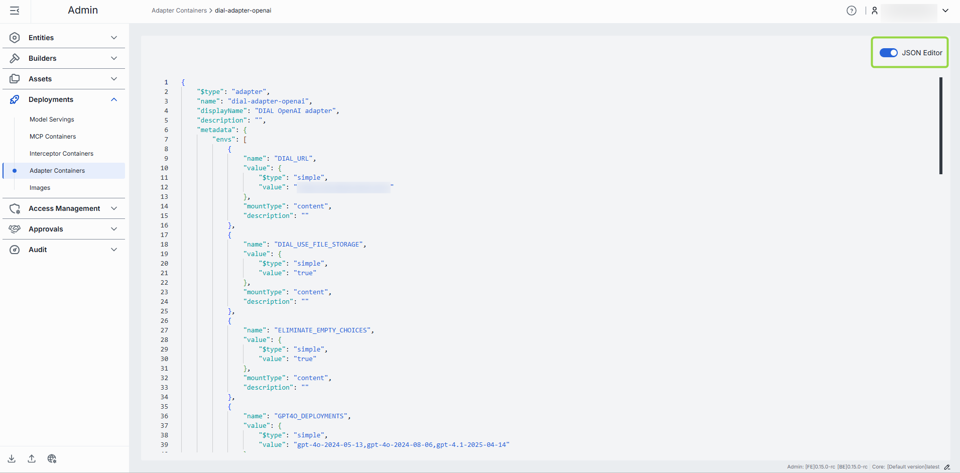 In Adapter Containers, you can manage containers for AI model adapters deployed within the DIAL system. You can create new containers based on existing images, start and stop running containers as needed, edit configuration settings, and view logs and events for troubleshooting.