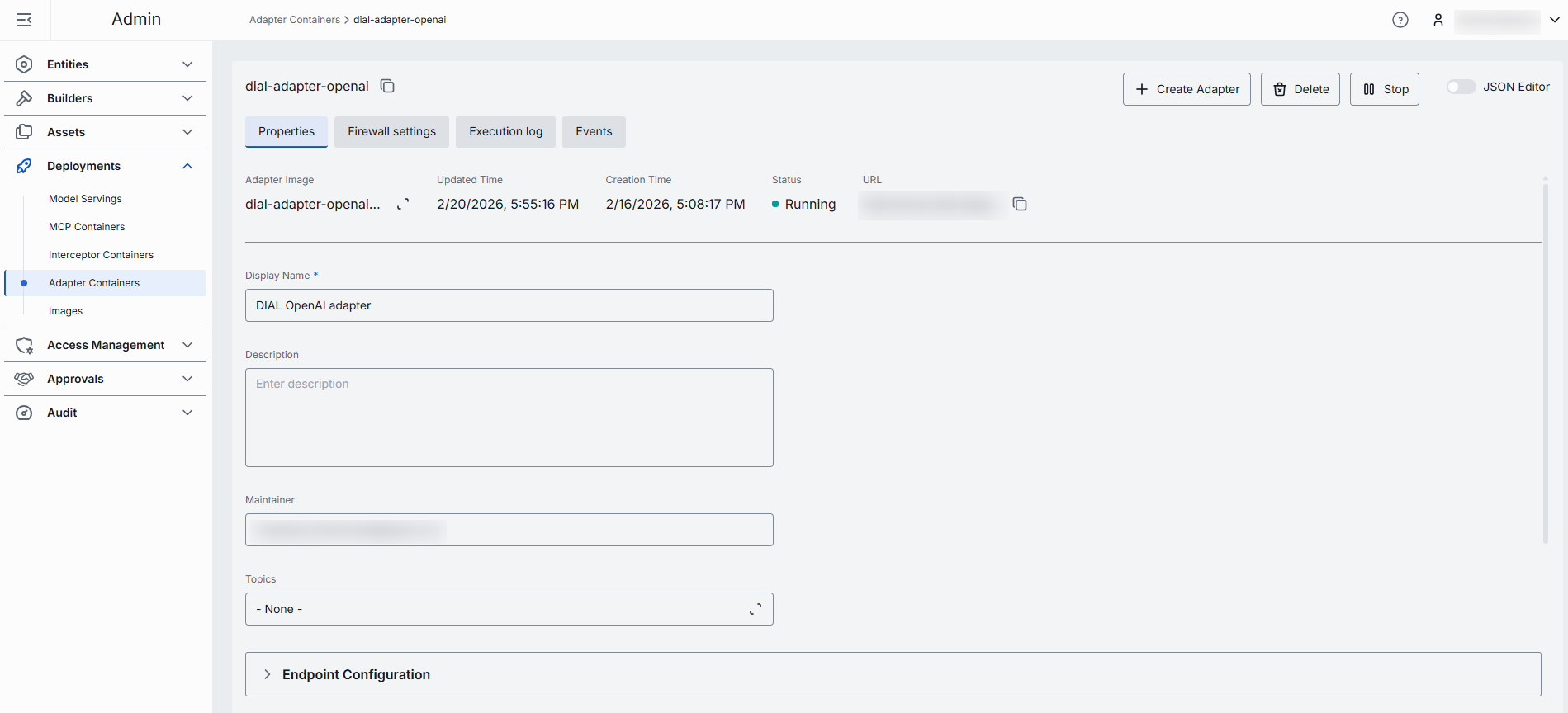 | Adapter Image | - | No | Image from which the container was created. Click to display the list of available images where you can change the source image for the container. Note: The container is redeployed when source image changes. |