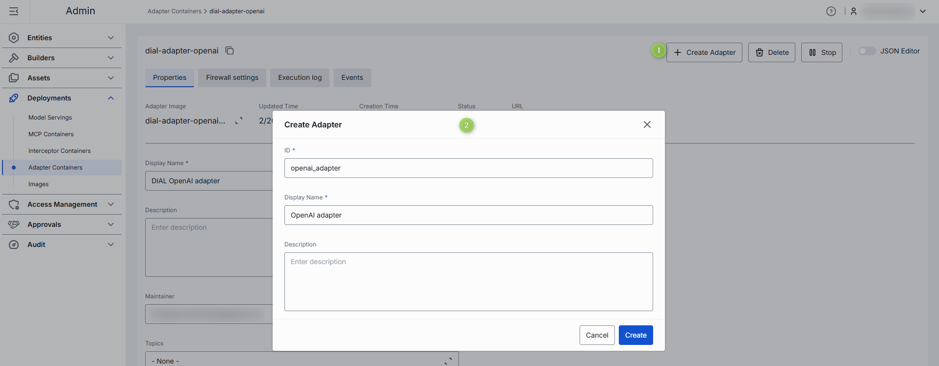 - Click Create to submit the form and create the adapter. Repeat these steps to create more adapters if needed.