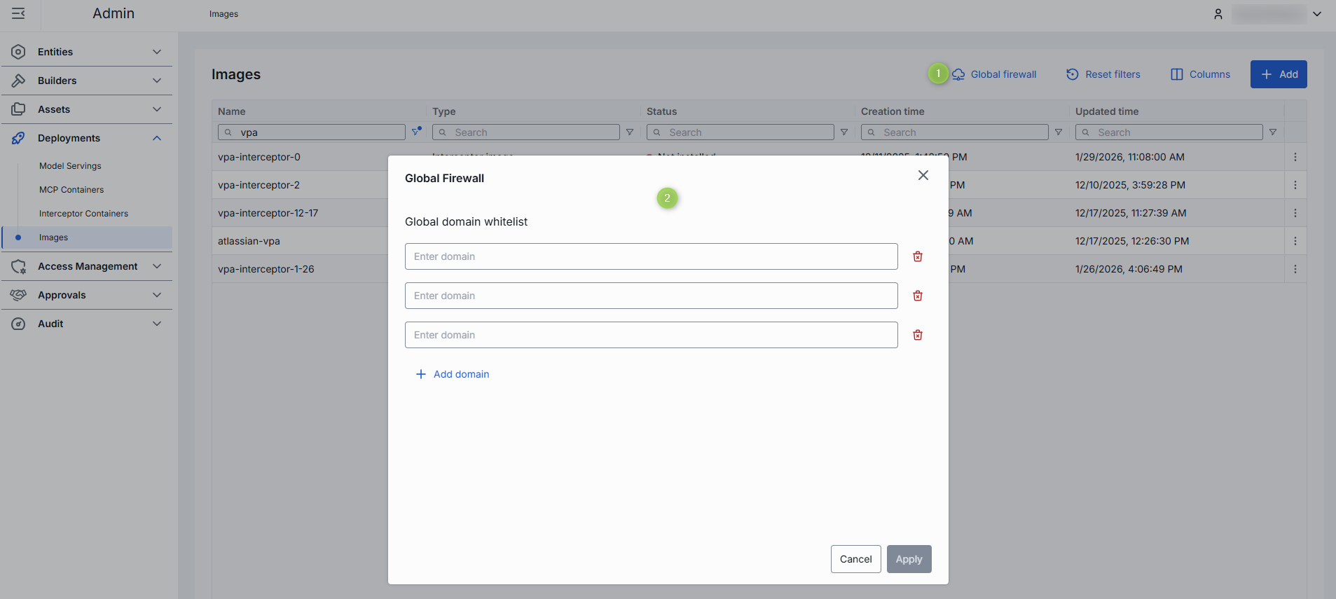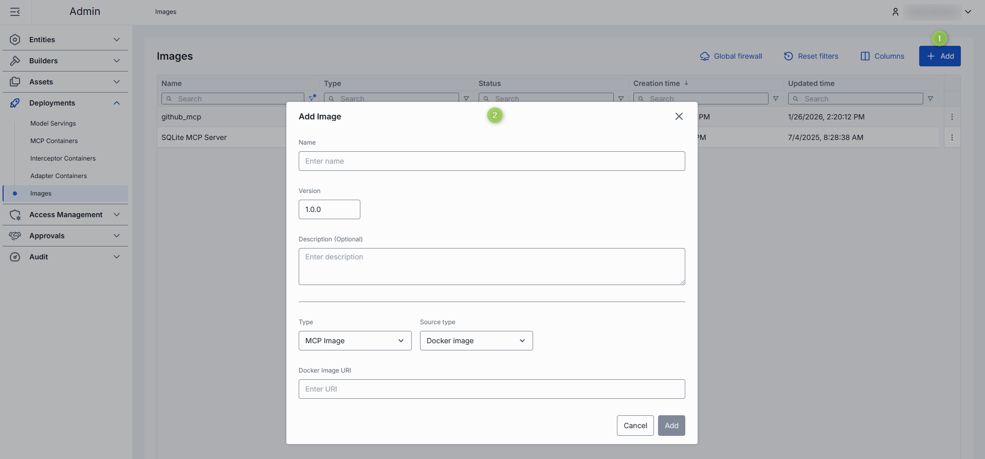 On the main screen, you can add new images for MCP Servers, AI Model Adapters and Interceptors.