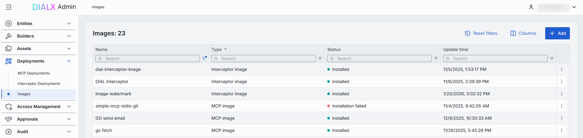 This page allows you to view, add and manage images for MCP servers, AI model adapters and Interceptors container deployments within the DIAL system.